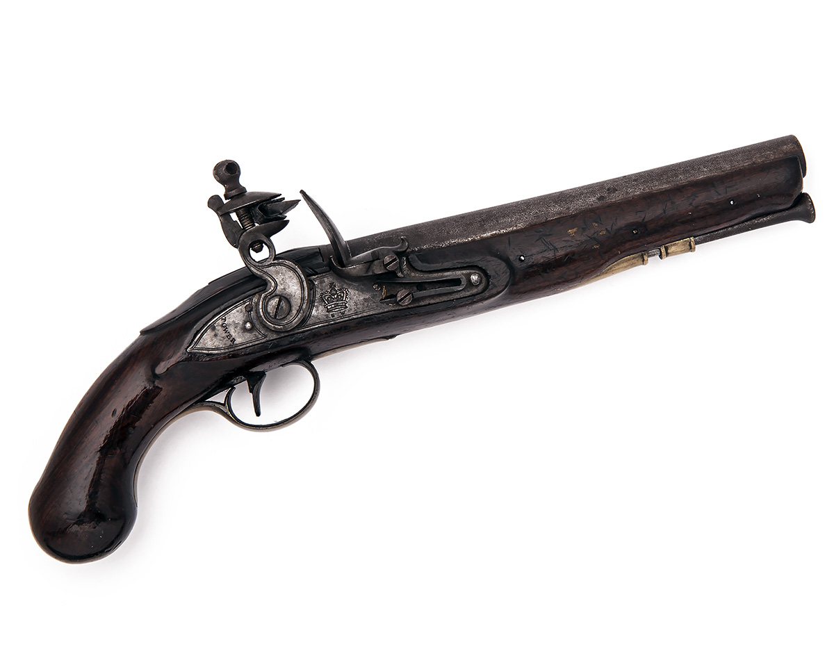 circa 1815, with Birmingham proved tapering iron 9in. barrel signed 'LONDON' near the breech and with moulded band, solid humped top-tang, borderline engraved lock signed 'TOWER' at the tail and marked with a crown below the pan above the letters 'S.W.', walnut full-stock with tear-drops and a carved apron around the top-tang, brass furniture and iron ramrod
