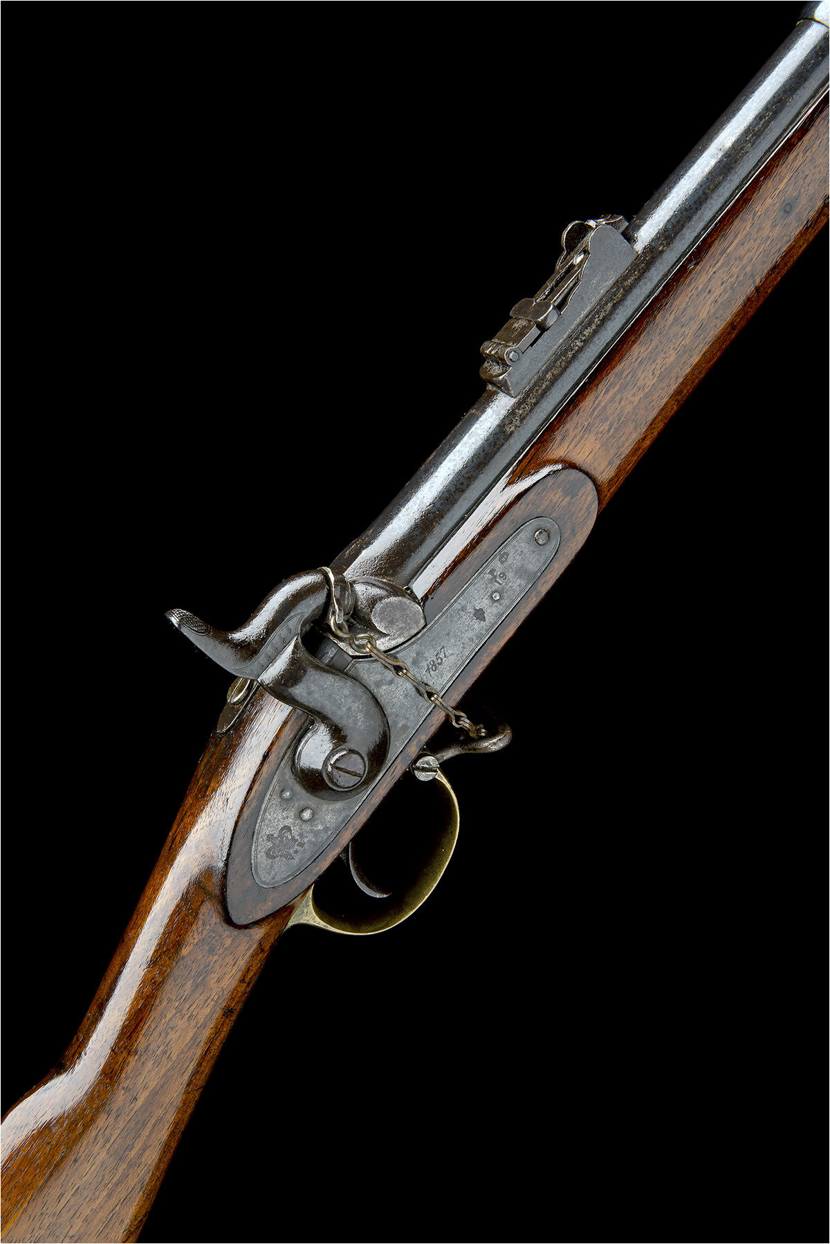 dated for 1857, with 39in. smoothbored barrel, block and blade fore-sight, elevating ladder rear-sight, sold out of service stamps at breech, Belgian produced borderline engraved lock engraved with the date and a crown over 'V*R' device, walnut full-stock stamped with an 1863 Pimlico rework mark, chained nipple protector, brass furniture, three iron barrel-bands and jag-ended ramrod
