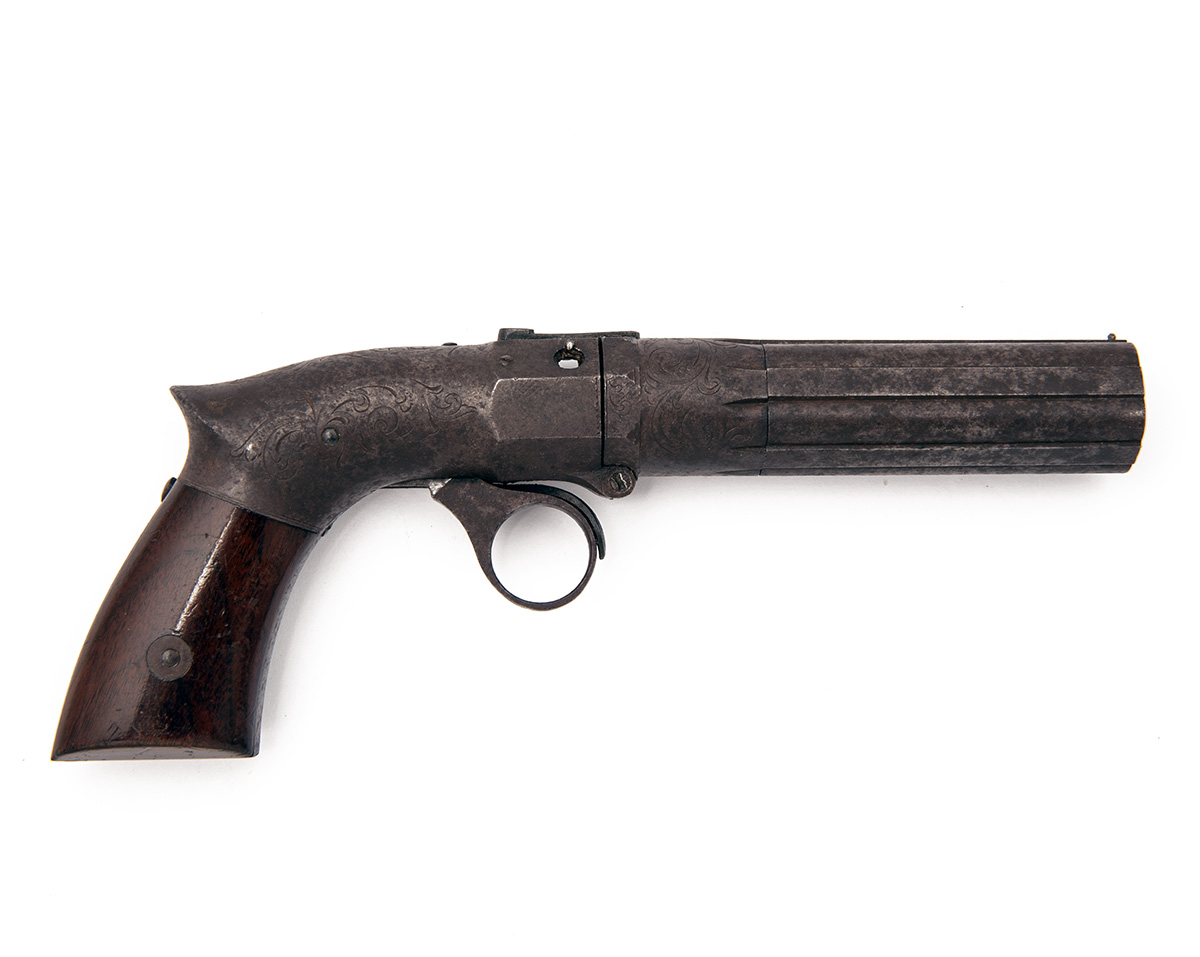 for between 1851-54, with turn-off rifled 3 1/8in. five-shot barrel group, one of the false ribs signed 'PATENT 1849', another 'ROBBINS & LAWRENCE CO' and another 'WINDSOR VT', scroll engraving to the breech-end and action body, the radiused action with octagonal front section, the top with push button barrel release, the barrels hinging down for capping, single-action ring cocking trigger with additional trigger to front, saw-handled frame with rear-mounted cocking indicator and smooth hardwood grips, traces of finish