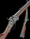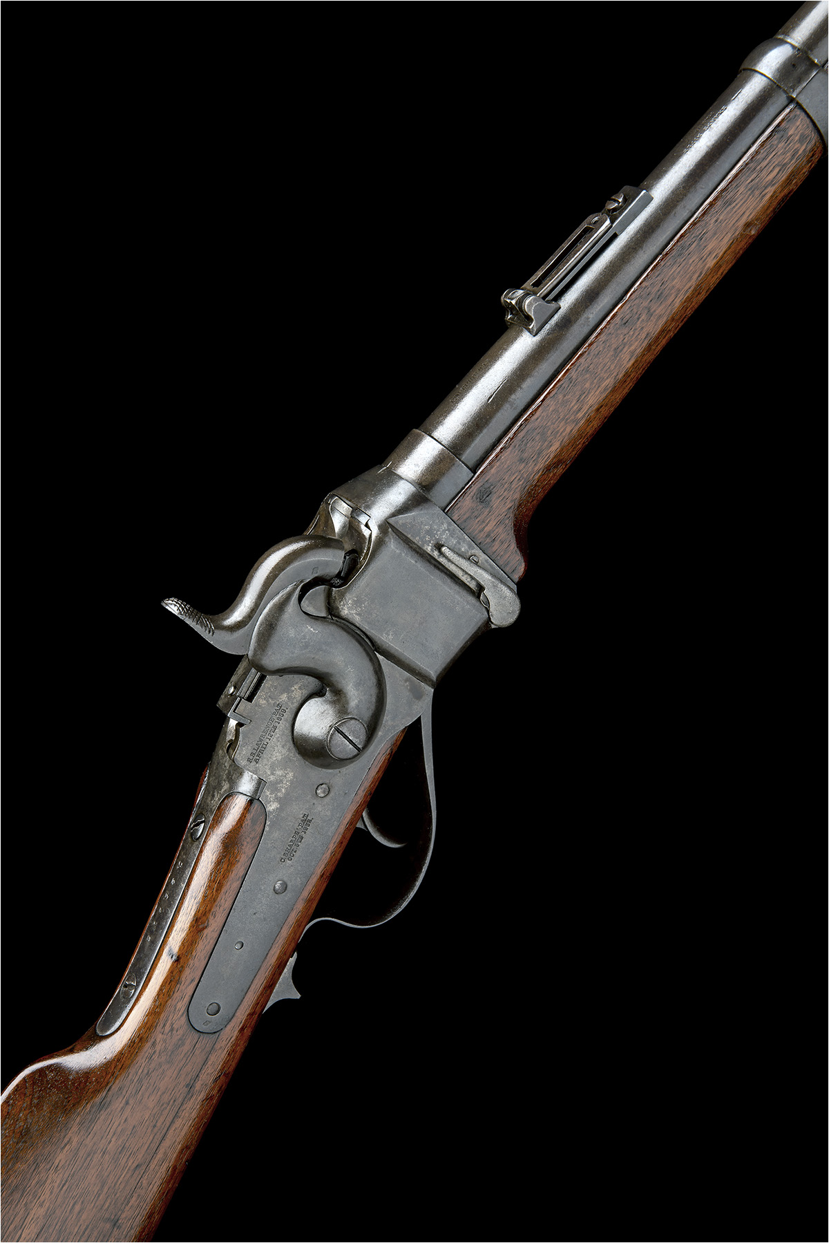circa 1864, with blued 22in. barrel, block and blade fore-sight, folding ladder rear-sight, 'NEW MODEL 1863' stamped at breech, vertical dropping block receiver, the lockplate with in-built pellet primer and marked 'R.S. LAWRENCE PAT. APRIL 12TH 1859', the body of the lock marked 'C. SHARPS PAT. OCT. 5TH 1852', straight hand walnut butt-stock, no provision for patchbox, iron heel-plate, under-lever opening, saddle-ring mounted to left hand side of the receiver, walnut splinter fore-end and single iron barrel-band