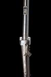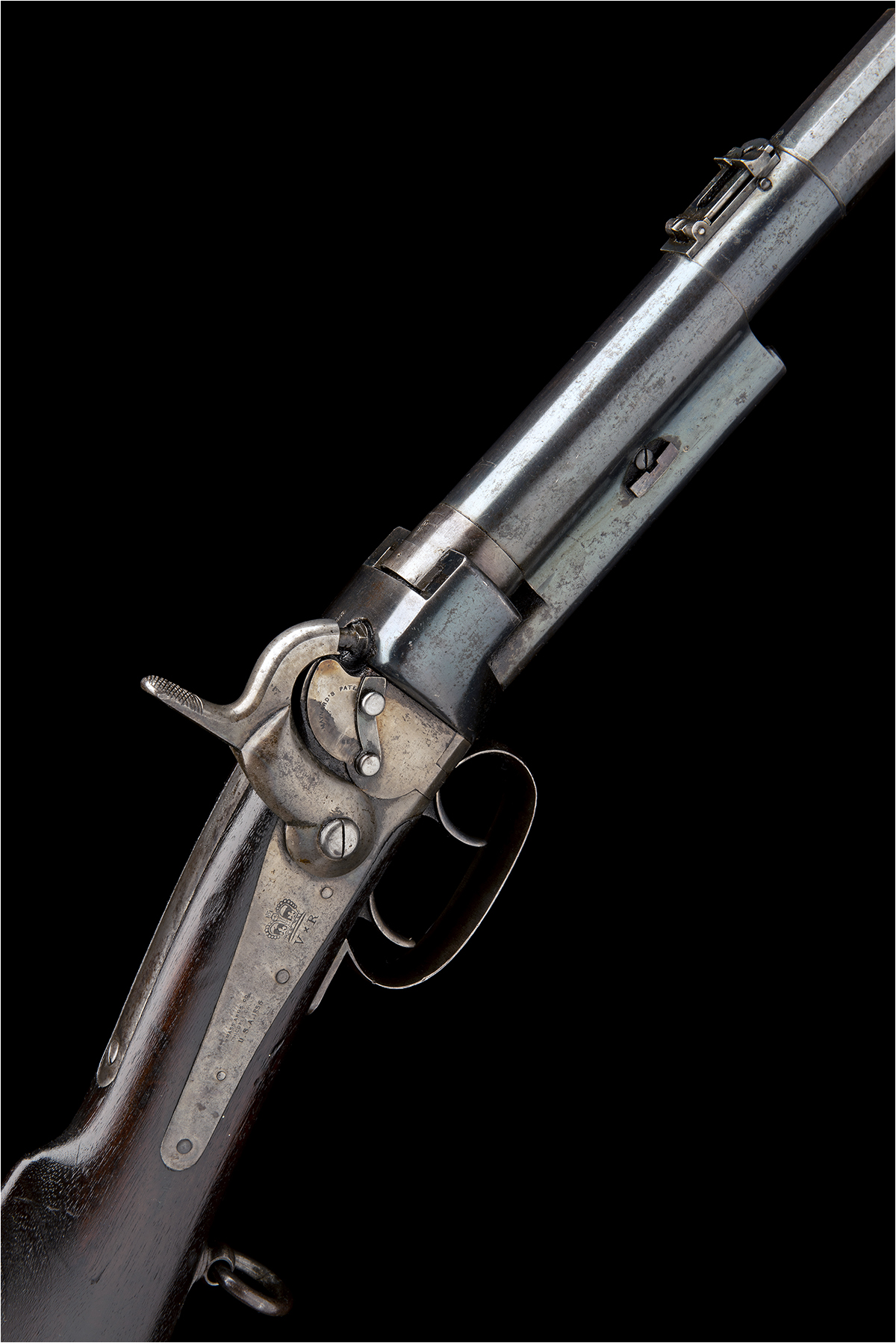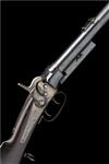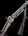 dated for 1856, with tapering round 18in. barrel, dove-tailed block and blade fore-sight, elevating ladder rear-sight, central section of outer barrel faceted for grip, plain receiver, long plain top-tang marked 'GREENE'S PATENT JUNE 27 1854', back-action lockplate fitted with 'Maynard's' tape priming system and marked 'MASS. ARMS CO. CHICOPEE FALLS USA 1856' a 'VR' crown cypher and 'MAYNARD'S PATENT SEPT 22 1845', plain hammer, walnut butt-stock with iron patch-box and semi-crescent heel-plate, stock marked 'B. 10. R.D.M.R.', saddle-ring to the trigger-guard tang, large trigger-guard bow with two triggers, the front one unlocking the barrel for loading, ordnance stamps and no provision for fore-end, much original finish remaining