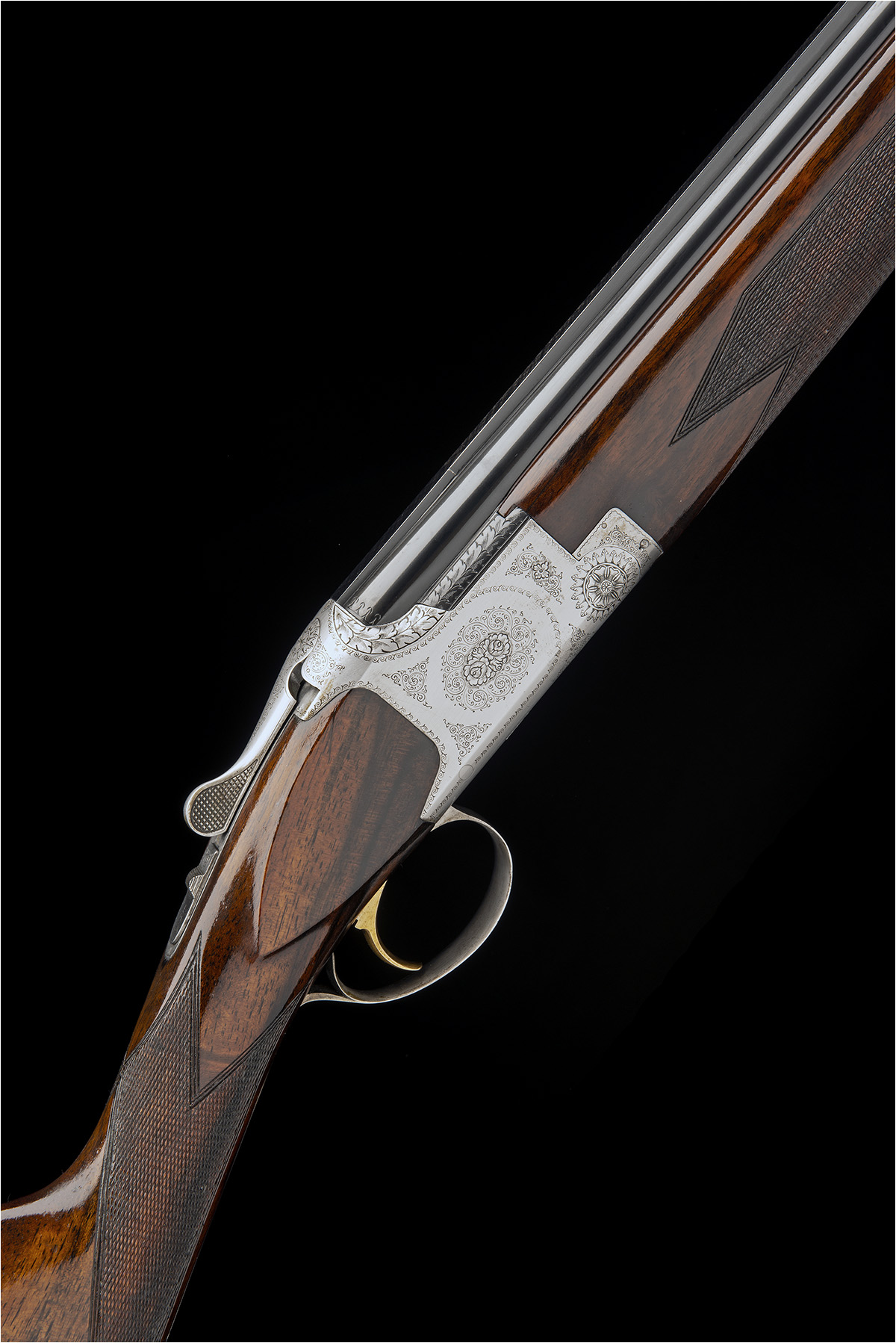 30in. sleeved nitro barrels with 5mm ventilated matt top-rib, 2 3/4in. chambers, bored approx. 1/2 and 3/4 choke, fore-end retaining catch removed, hold-open toplever, manual safety with integral barrel selector switch, gold-washed single trigger, border and partial scroll engraving, 15in. stock including 1 1/8in. wooden extension, weight 6lb. 4oz.