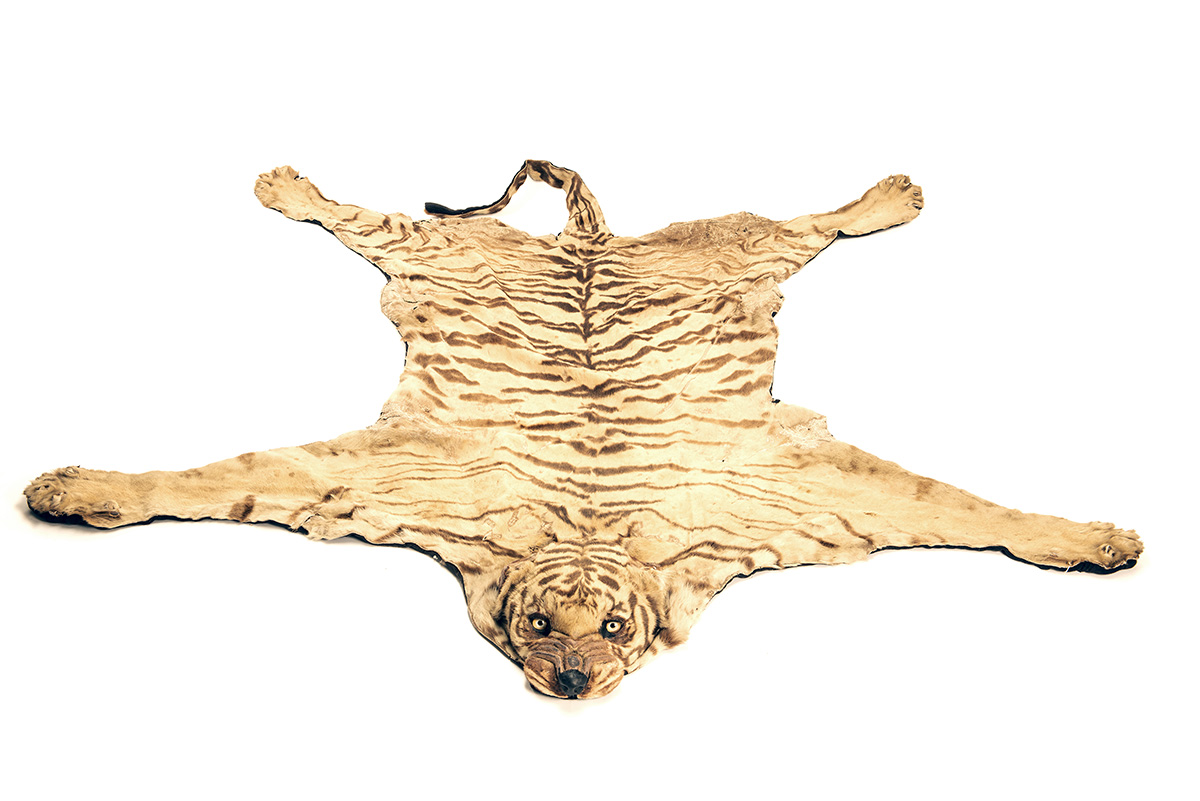 A VINTAGE RUG-MOUNT OF A TIGER,