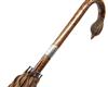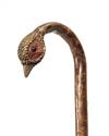 with brown faded cotton canopy measuring approx. 34in., brass tip ferrule, crook handle with carved pheasant head with glass eyes, with silver band marked 'EM BELL, Northend, Durham, with London silver hall marks dated 1912