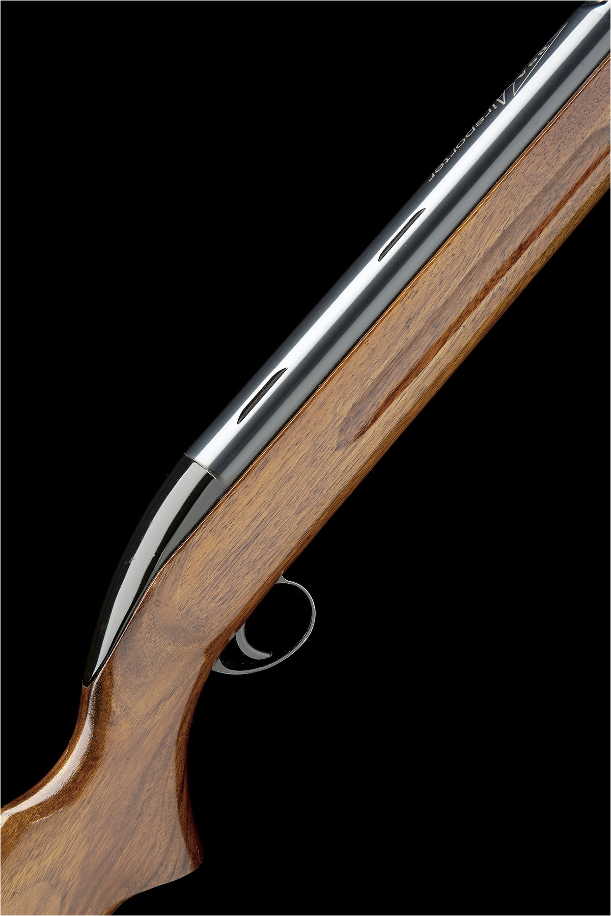 for 1959-65 and also known as the 'CLUB MKII' (not marked as such), with blued 18in. barrel, ramp fore-sight with blade and protector, folding notch rear-sight, automatic opening loading tap, blued air-chamber with etched 'BSA AIRSPORTER' and 'arrow' trade-mark, four individual grooves for sight mounting, black enamelled trigger-unit, three-piece laminated walnut butt-stock with ribbed heel, flush fitting blued under-lever and retaining virtually all its factory finish