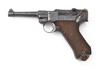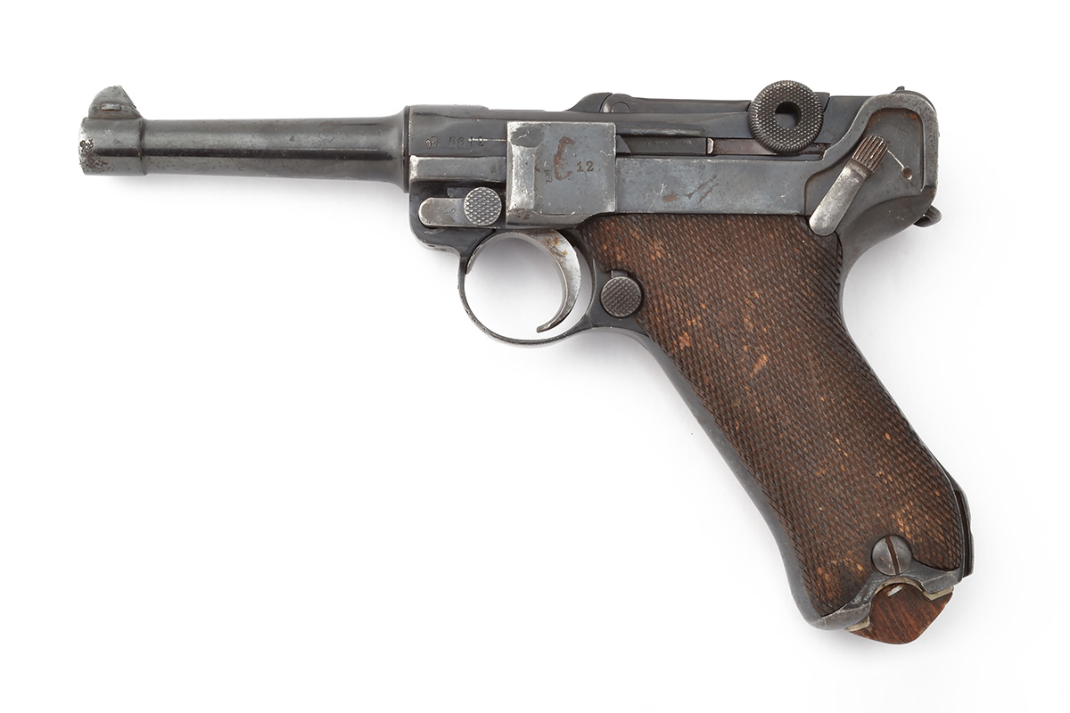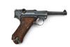 * A 9mm (PARA) SEMI-AUTOMATIC SERVICE PISTOL SIGNED DWM, MODEL 'P08 LUGER', serial no. 6612, dated for 1918, with 4in. barrel, toggle action receiver, chequered wood grips and plated magazine (wood base broken), old refinish