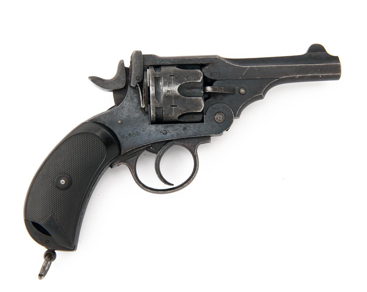 * A P. WEBLEY, BIRMINGHAM & LONDON .455 SIX-SHOT SERVICE-REVOLVER, MODEL 'MKII', serial no. 44509, pre 1896, with 4in. barrel, integral blade fore-sight, sighting notch to the stirrup barrel locking catch, fluted coin-release cylinder with holster guides, broad hammer, chequered hard rubber grips with birdshead butt (both grips with losses at toe), lanyard ring at base, fair amount of original two-tone blued finish