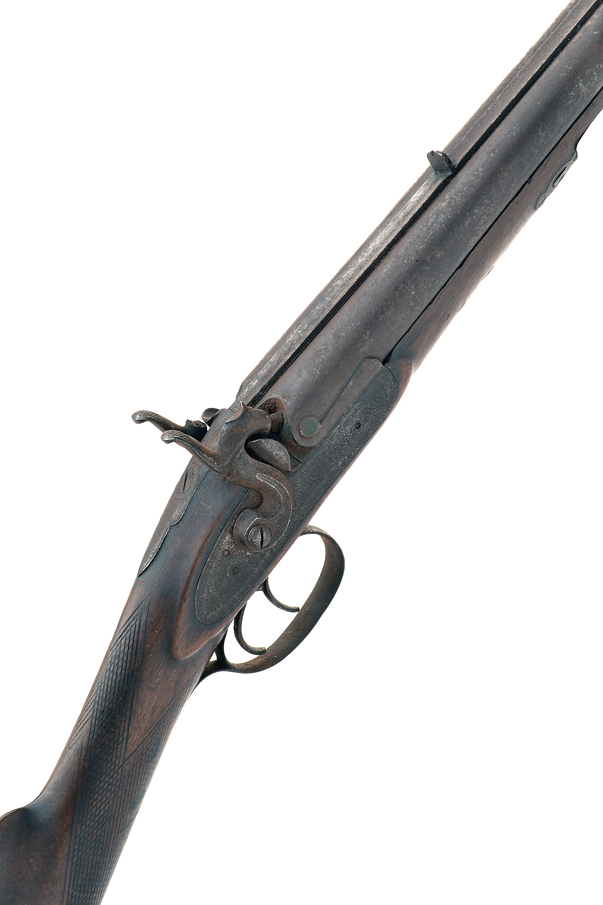 A 14-BORE PERCUSSION DOUBLE-BARRELLED SPORTING-GUN SIGNED W. RAWBONE, CAPE TOWN, no visible serial number,
