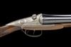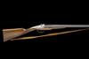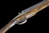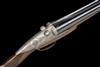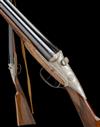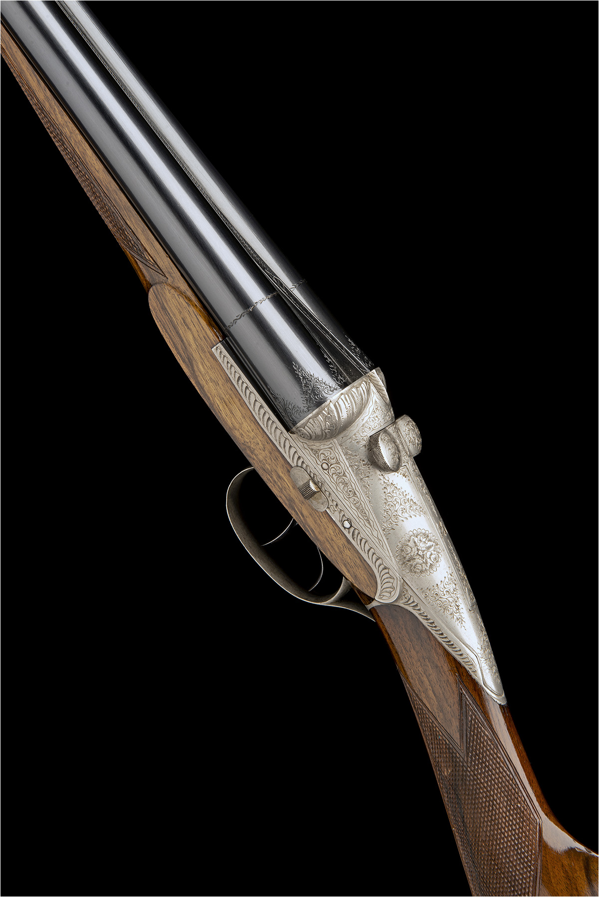 27 5/8in. (70cm) nitro monobloc barrels with sunken matt top rib and no under rib, scroll engraving at the breech end, 7 punch marks, 2 1/2in. chambers, bored approx. 1/4 and 3/4 choke, sprung sliding-breech with converging obturator discs, button barrel release, manual side safety, bouquet and scroll engraving with carved leaf fences, bright finish overall, 14 3/4in. stock including trademarked buttplate, sling swivels, fore-part with horn finial, weight 6lb.