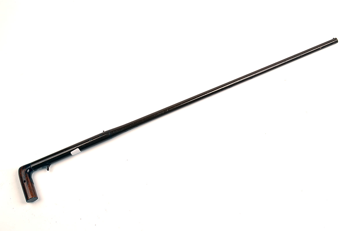 A .410 (2in.) WALKING-STICK SHOTGUN, no visible serial number, English, with slightly shortened 24in. barrel, brown enamel finish, twist and pull action with exposed trigger and side safe and walnut grip with socket for shoulder stock (missing)