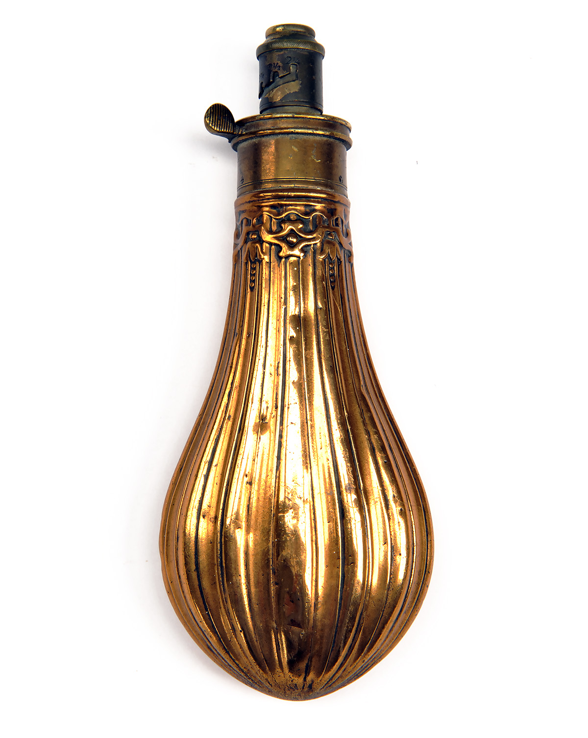 A MID VICTORIAN POWDER-FLASK SIGNED HAWKSLEY, with fluted body (Riling 289)