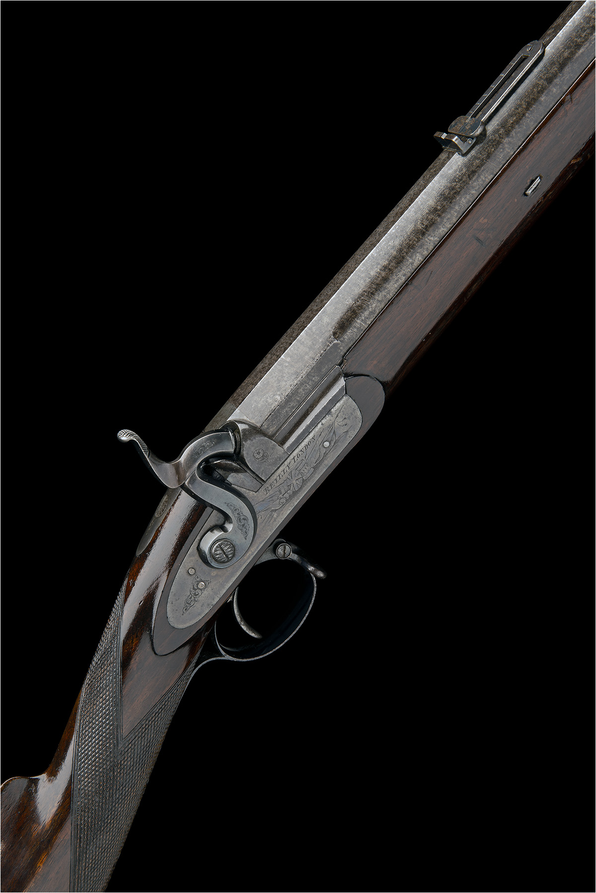circa 1855, with browned ovoid 32in. barrel rifled in four grooves, the full-length flat sighting plane signed 'REILLY, NEW OXFORD STREET, LONDON', small dove-tailed blade fore-sight, elevating folding ladder rear-sight with additional standing notch and when folded concealing the Reilly motto 'VENI VIDI VICI' (I came, I saw, I conquered), plain colour hardened breech-block and top-tang with scroll engraved detail around the top-nail, plain colour hardened lock engraved with a martial trophy to the bar and a panel of scroll engraving to the tail, the bar further signed 'REILLY, LONDON', straight hand dark walnut three-quarter stock chequered at the wrist, blued iron furniture, short under-rib with turned throat and plain thimble, brass tipped iron ramrod and 'Brunswick' style bayonet bar to muzzle, much original finish remaining