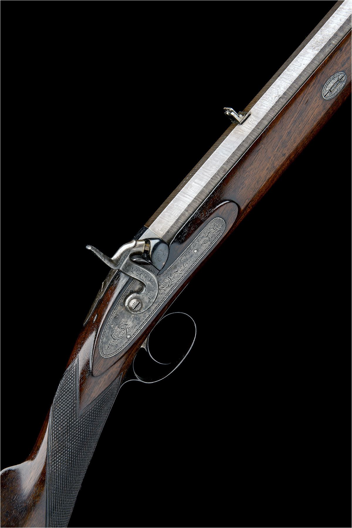 circa 1855, with heavy twist-iron 32 1/2in. octagonal barrel with squared breech, the top-flat signed 'ABERDEEN', dove-tailed white-metal fore-sight, standing notch rear-sight with additional folding leaf, engraved top-tang, border and scroll engraved lock signed 'R. WILSON', engraved hammer, walnut straight hand half-stock chequered at the wrist, iron furniture, vacant oval to underside of butt and brass tipped wood ramrod