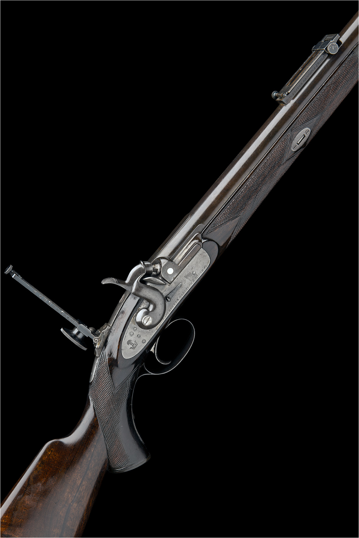 circa 1865 with 35 7/8in. re-blued round heavy barrel marked 'WHITWORTH PATENT' towards the breech, squared mounting-block for the dove-tailed windage adjustable tunnel fore-sight with spirit level, the mounting-block for the ladder rear-sight signed 'MANCHESTER ORDNANCE & RIFLE CO.', the ladder marked 'PATENT', squared patent breech (traces of colour), plain tang fitted with mounting-block for aperture vernier target sight (present), detented bolted lock signed 'MANCHESTER ORDNANCE & RIFLE CO.' and with the Whitworth trademark on the tail (colour faded), well figured walnut pistolgrip half-stock with chequered grip and fore-end (cracked and repaired at wrist), back position sight mount base inlet into comb, chequered iron butt-plate, horn fore-end cap and pistol grip cap, chequered trigger-blade, silver escutcheon to underside of stock and no provision for ramrod