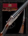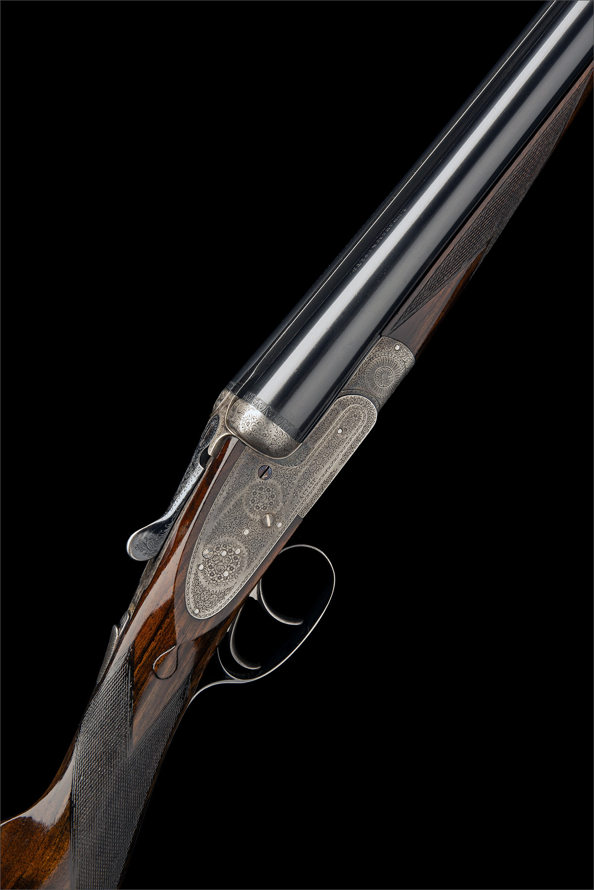 25in. nitro reproved barrels with matt Churchill-rib, the tubes engraved 'J. GRAHAM & CO. LTD. 27. UNION STREET. INVERNESS.', 2 1/2in. chambers, bored approx. 1/4 choke in both, treble-grip action with hidden third bite, removable striker discs, automatic safety with gold-inlaid 'SAFE' detail, gold-inlaid cocking-indicators, fine acanthus scroll engraving with floral bouquets, retaining traces of original colour-hardening and finish, 14 1/4in. figured stock, weight 6lb. 2oz., in its lightweight leather case