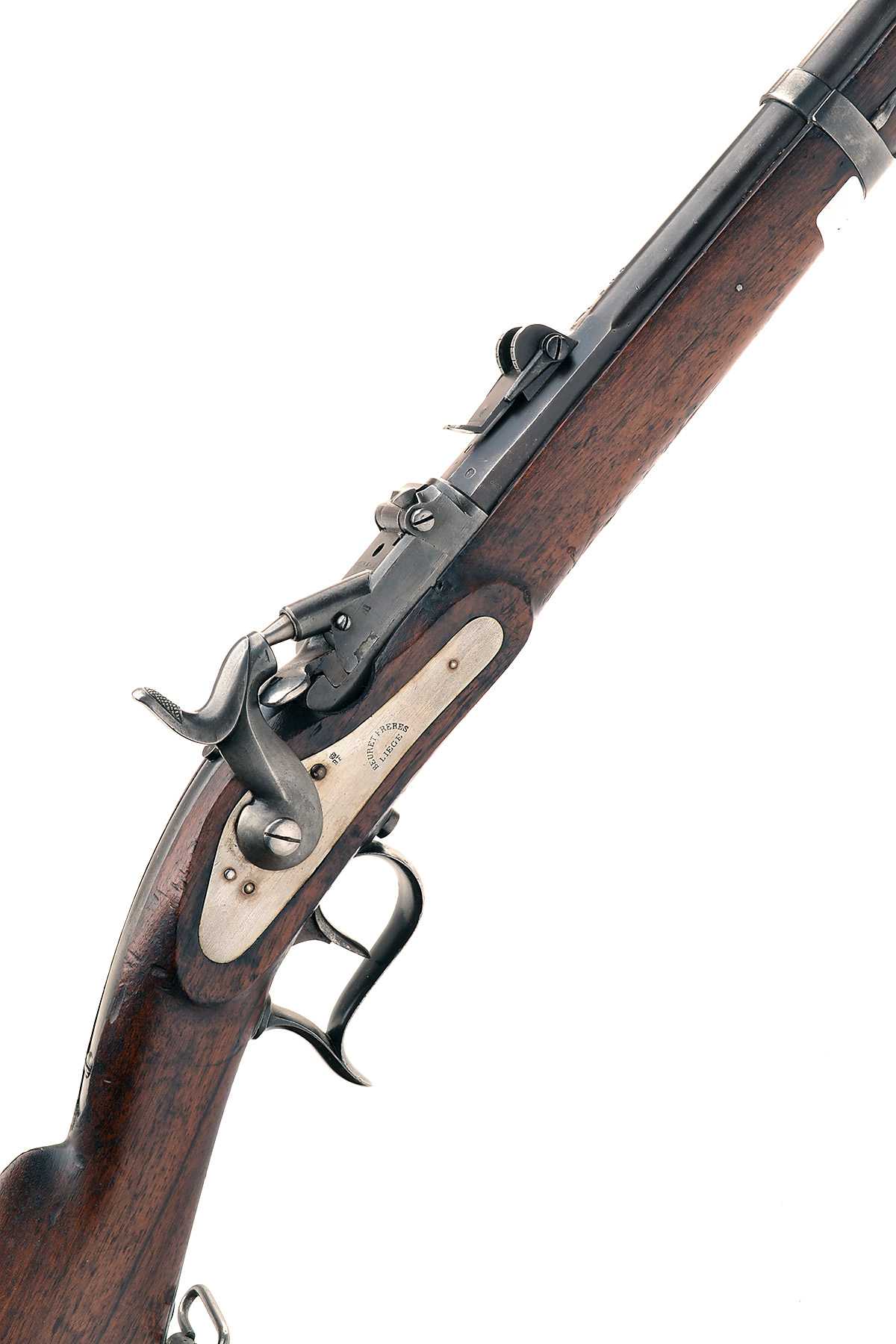 A 10.53mm (SWISS) SINGLE-SHOT BREECH-LOADING JAEGER-RIFLE SIGNED 'BEURET FRERES' MODEL 'AMSLER-BLANK CONVERSION', serial no.205 circa 1880, with 34in. barrel, block and blade fore-sight, elevating rear-sight, the top of barrel stamped 'KL' bisected with a shield forwards of the rear-sight together with the serial number, lift-up trapdoor conversion signed 'AMSLER-BLANK', flat polished hump-back lock signed 'BEURET FRERES LIEGE', walnut three-quarter stock, jaeger-style butt stamped 'KL' with the shield device over '205', iron furniture including two barrel bands and a nose-cap, cup-ended iron cleaning rod and iron swivels