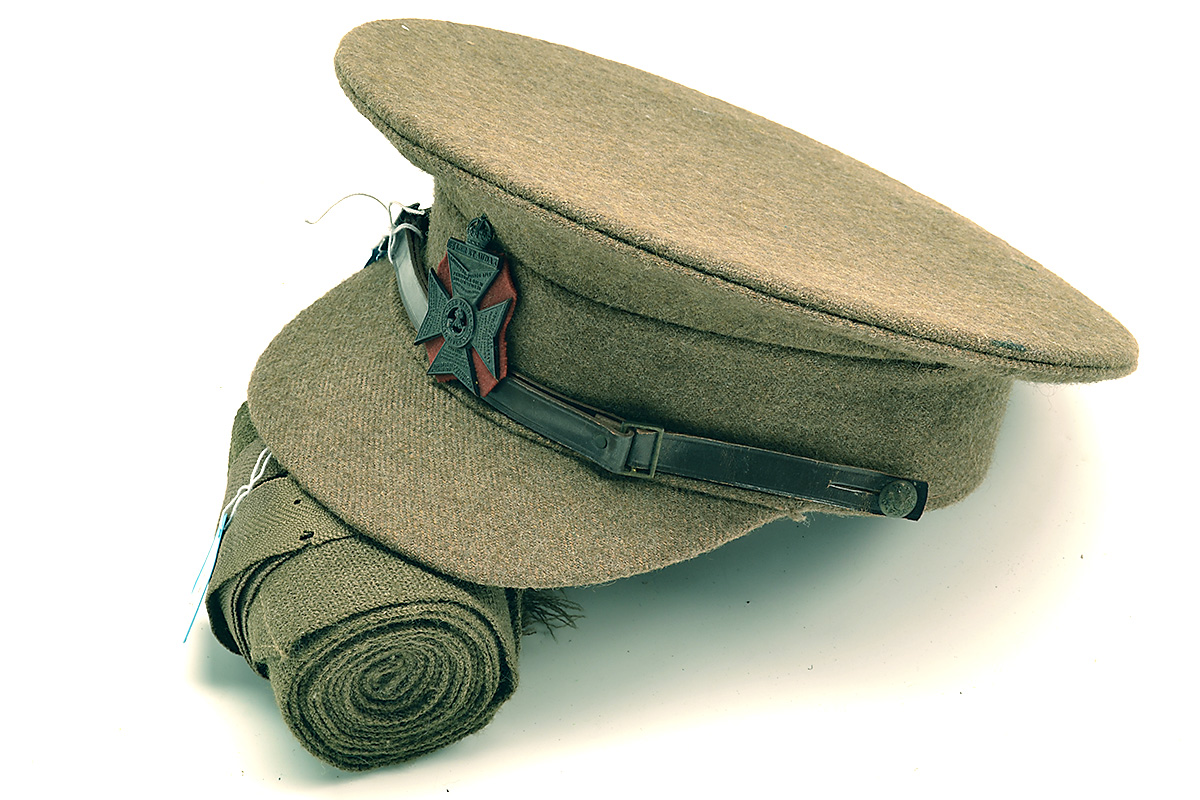 A BRITISH ARMY S.D. CAP BADGED TO THE K.R.R.C. TOGETHER WITH A PAIR OF WW2 PUTTEES, (2)