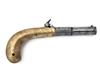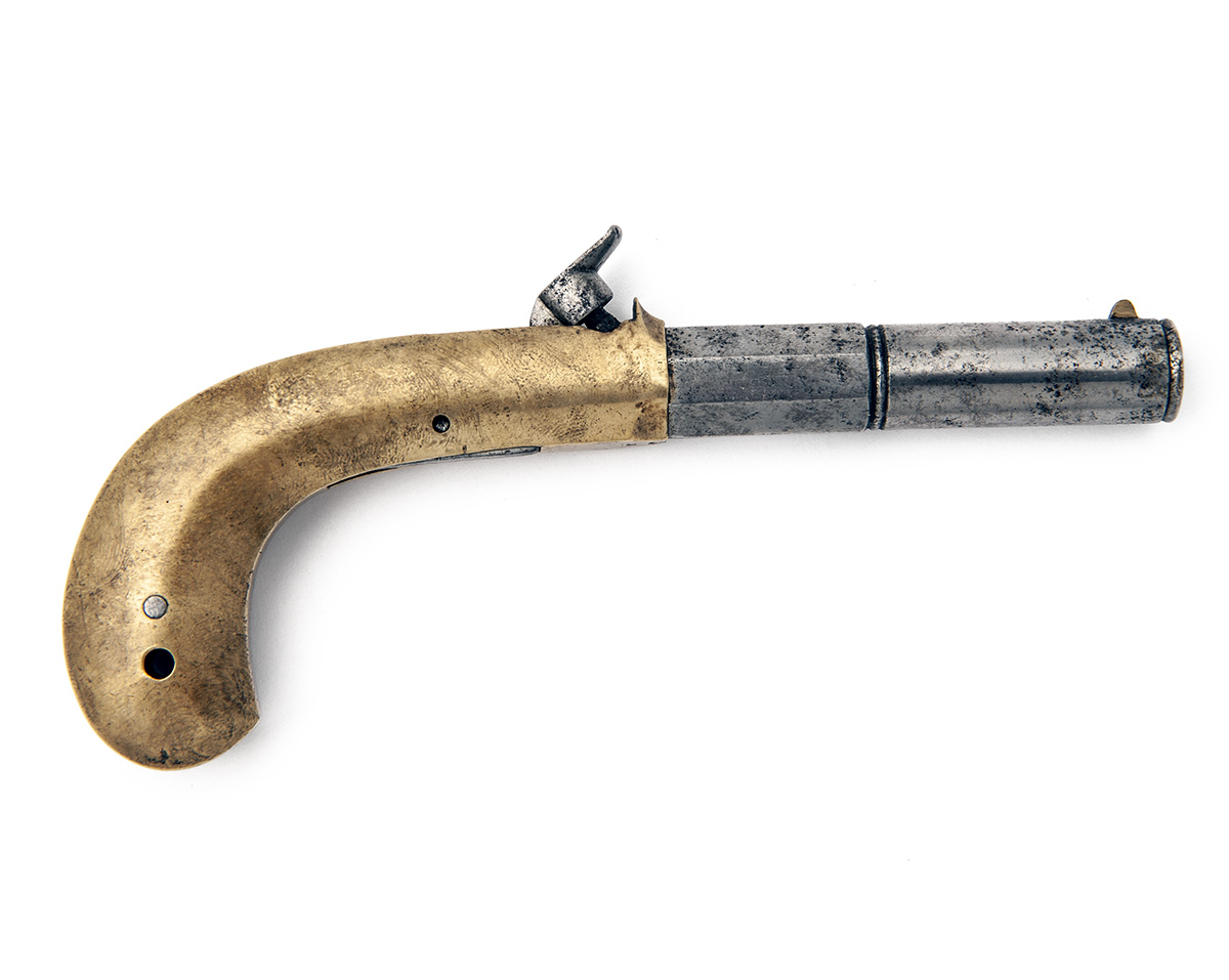 produced between 1838-41, with turn-off two-stage brushed bright 3in. rifled iron barrel, carved bands at the muzzle and intersection, the top-flat at breech signed 'FAIRBANKS BOSTON' (traces only legible), the adjacent left hand flat 'CAST STEEL', plain moulded brass butt with semi birdshead grip pierced through with lanyard aperture, concealed iron trigger and exposed off-set top-hammer