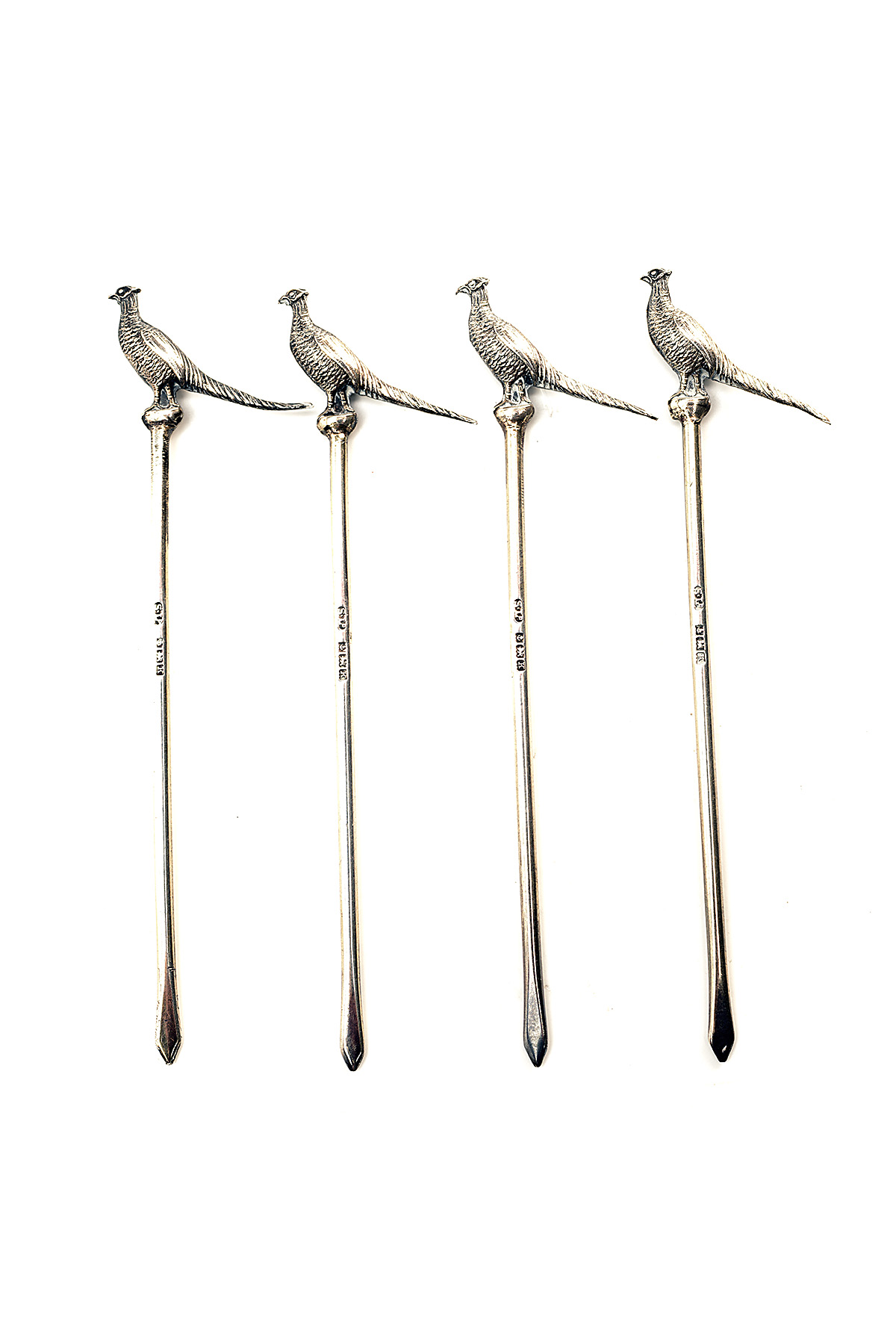 A SET OF FOUR VINTAGE SOLID SILVER PHEASANT COCKTAIL STICKS,