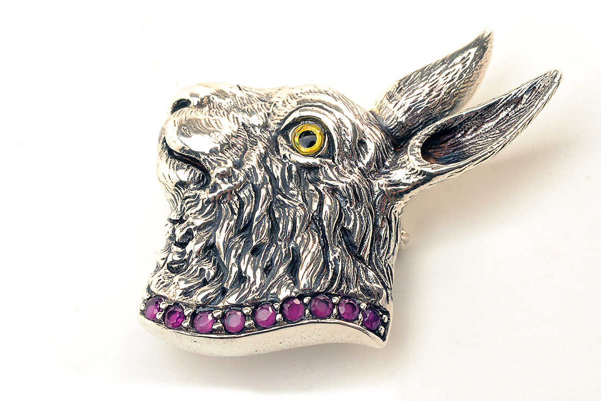 A MODERN STERLING SILVER AND RUBY HARE BROOCH,