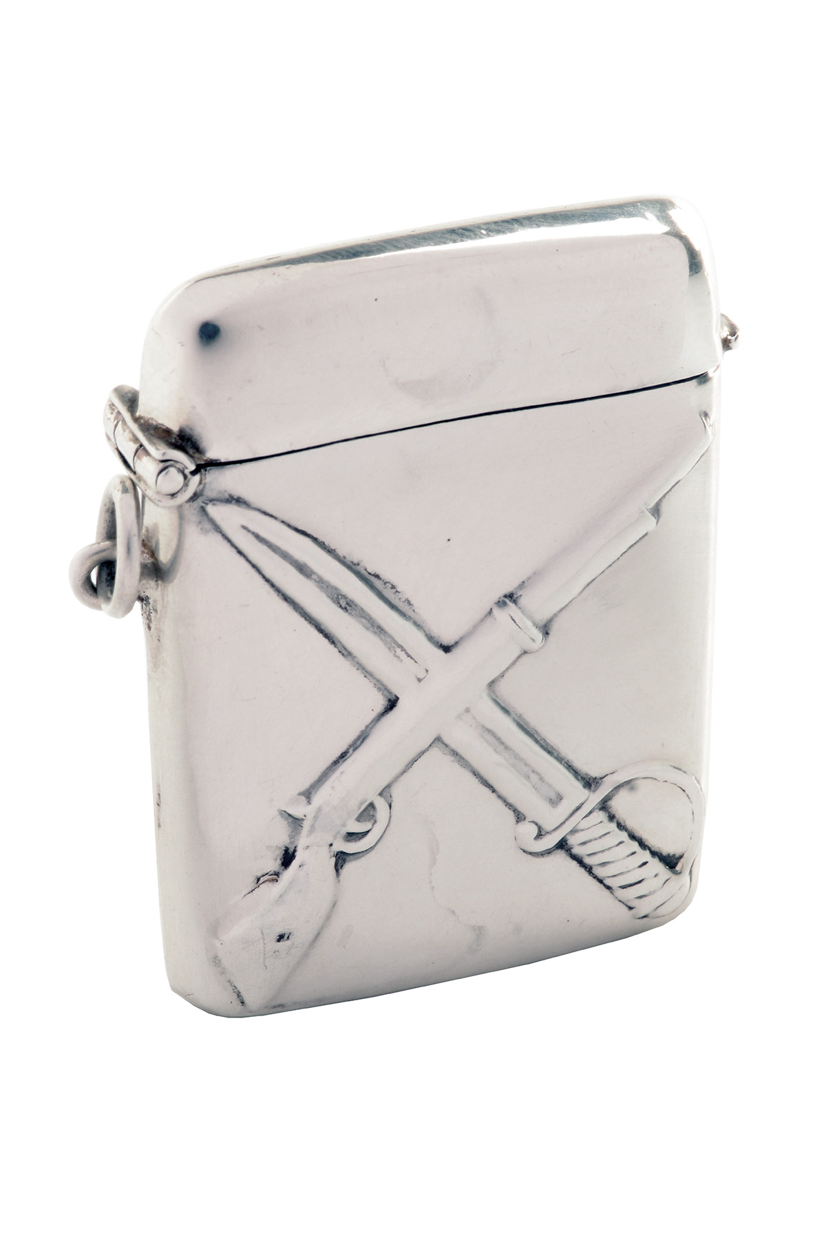 A VINTAGE STERLING SILVER VESTA MATCH CASE, marked ' 925 SILVER' embossed with crossed sword and gun, hinged lid, small lanyard ring,