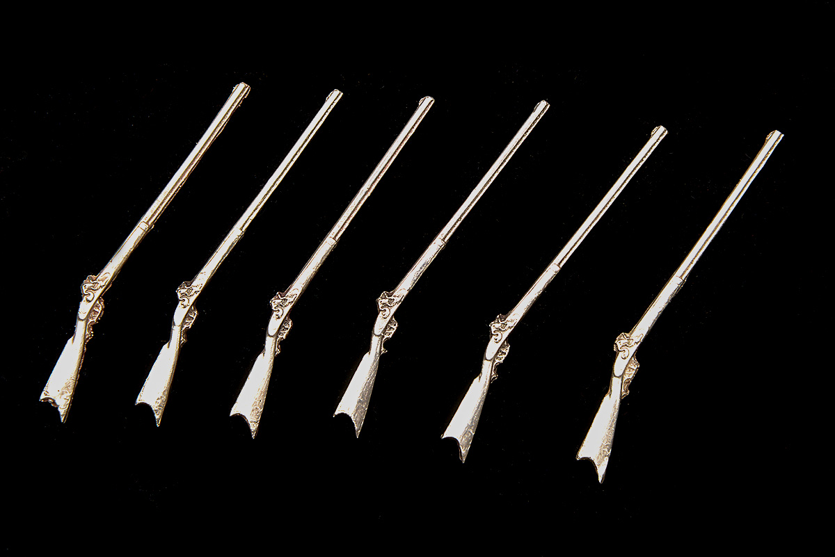 A COLLECTION OF SIX MINIATURE SILVER REMINGTON PERCUSSION RIFLES, measuring approx. 3in.