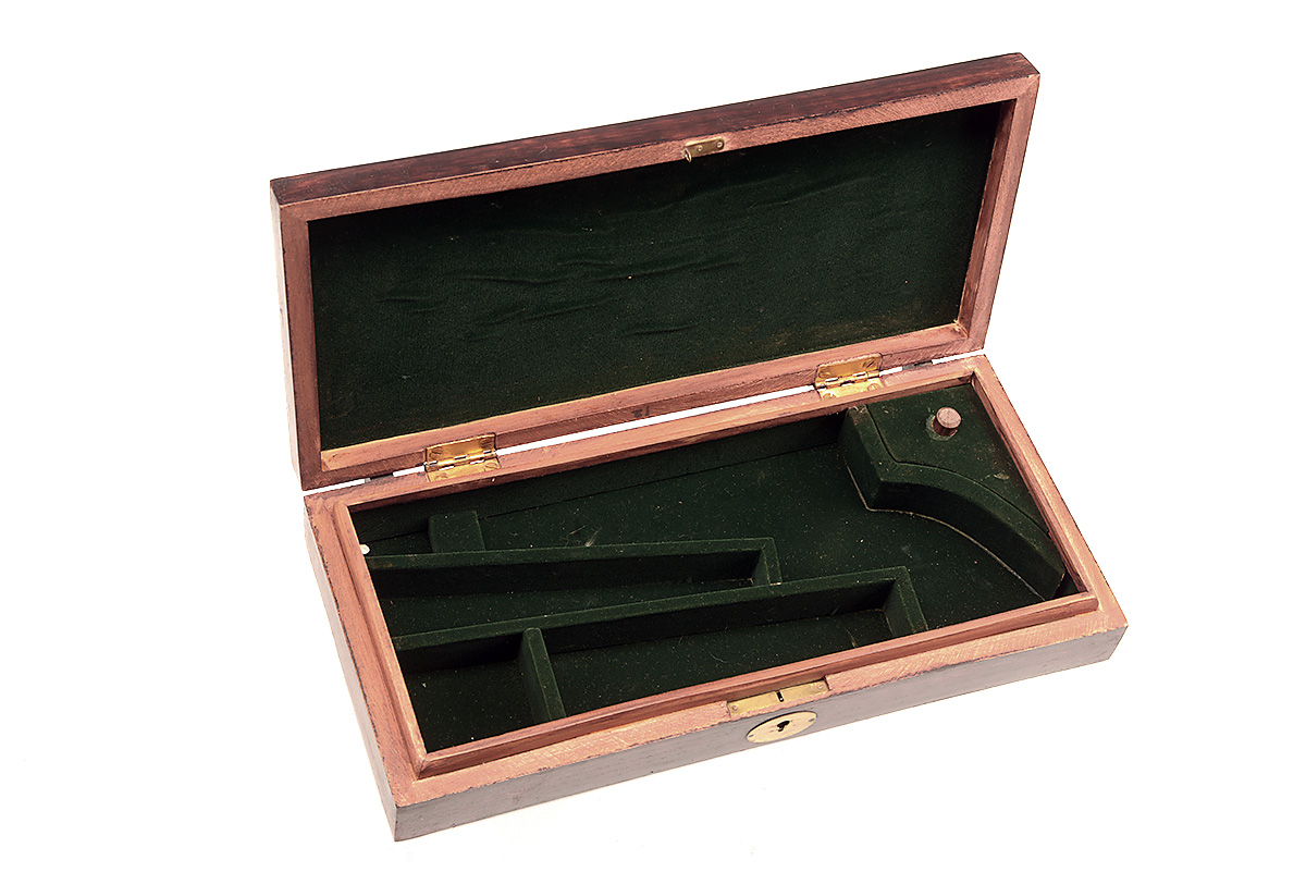 A MODERN WOODEN REVOLVER BOX, the interior lined with green baize, brass lock (key missing), the lid exterior with a brass plaque with 'FROM ALL THE MEMBERS WARRANT OFFICERS AND SERGEANTS MESS'