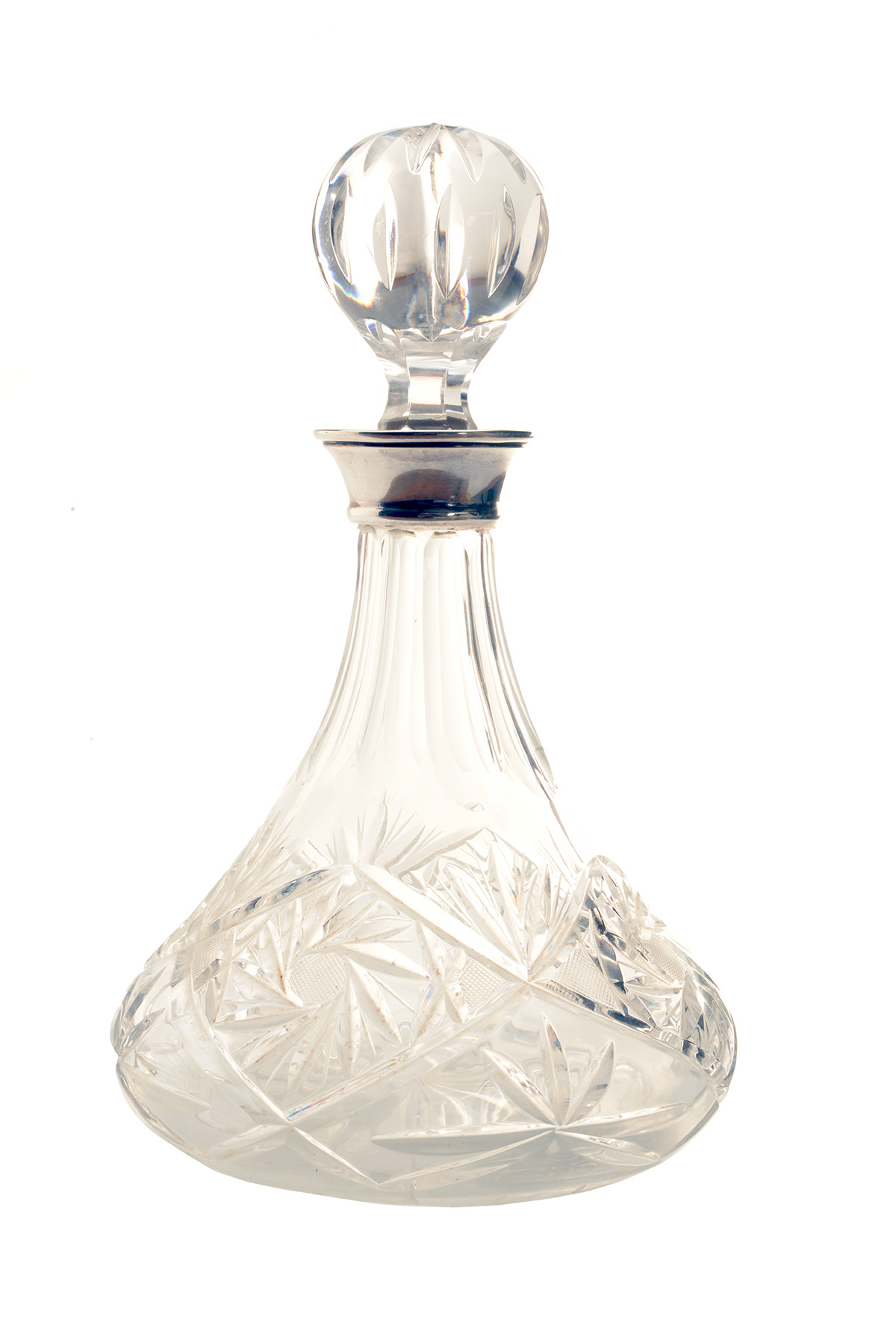 A MAPPIN AND WEBB LTD. CUT GLASS SHIPS DECANTER,