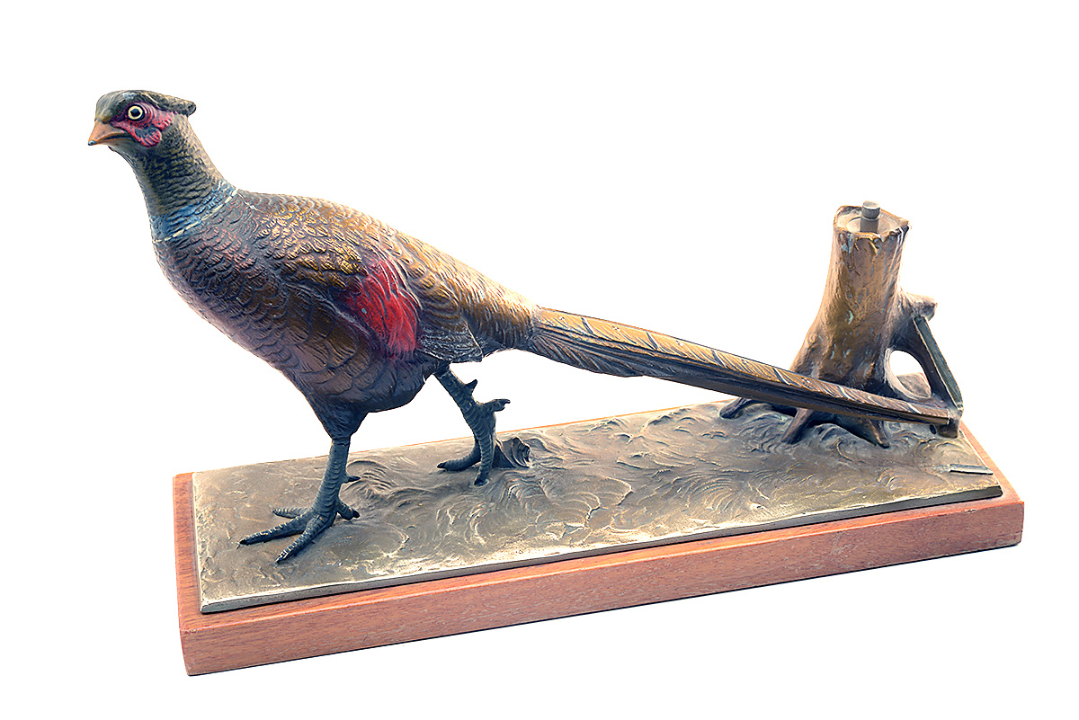 A PAINTED BRONZE OF A FULL-MOUNT PHEASANT SET ON A BRASS PLAQUE WITH FUEL MATCH,