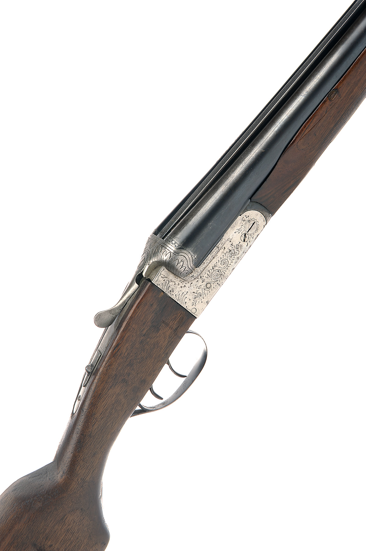 ILJA 12-BORE (3IN.) BOXLOCK NON-EJECTOR, serial no. 12540, 32in. nitro barrels, 3in. chambers, bored approx. full choke in both, bolstered treble-grip action with hidden third bite and sideclips, removable striker discs, automatic safety, border and partial scroll engraving, 14 1/4in. replacement pistolgrip stock including 3/4in. ventilated rubber recoil pad, beavertail fore-end