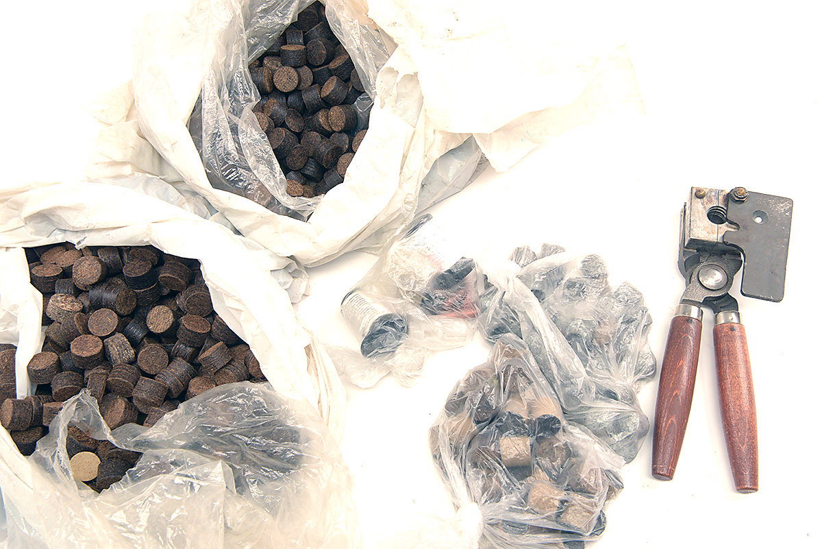 A COLLECTION OF CARTRIDGE RELOADING ITEMS, comprising of approx 800 12-bore plastic wads, 350 fibre wads, bullet mould, lead bullet heads, approx. 40 12-bore spent cartridge cases a Lee Auto priming tool