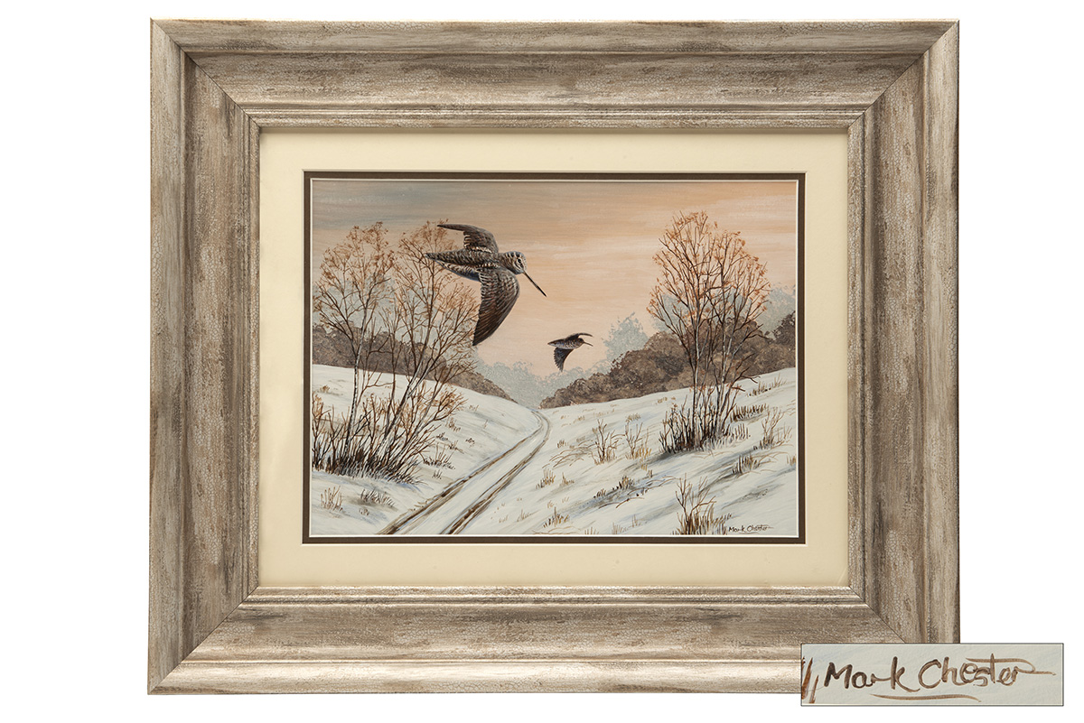 an original painting signed by the artist, showing a brace of woodcock in flight in a winter scene, glazed and framed in a wooden framed measuring approx. 18in. x 15in.