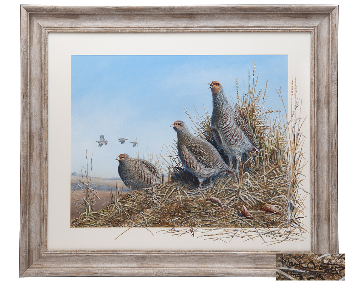 an original painting signed by the artist, showing calling partridges, glazed and set in a wooden framed measuring approx. 28in. x 25in.