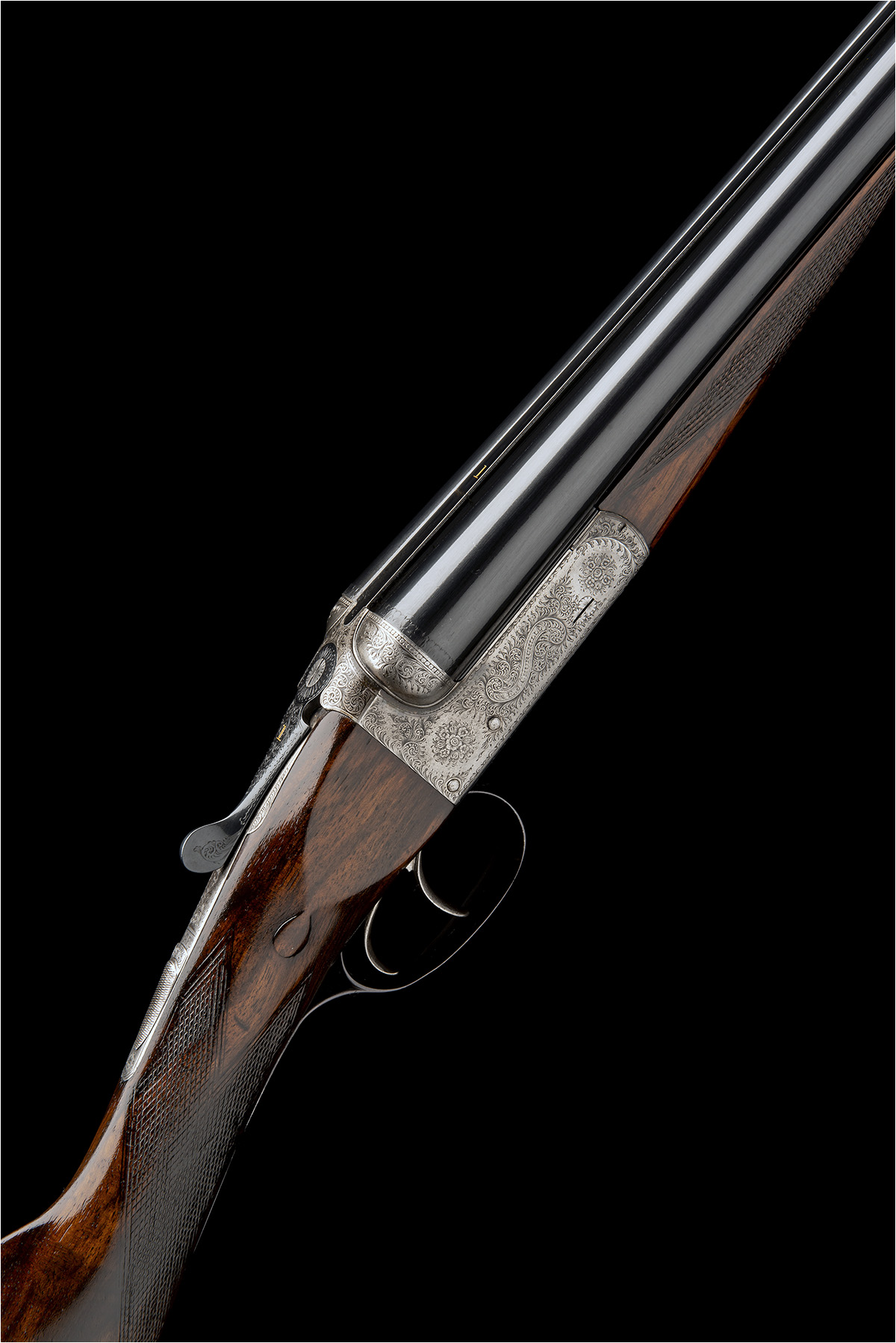 28in. nitro reproved barrels, rib engraved 'E.J. CHURCHILL. 8. AGAR ST. STRAND. LONDON. W.C.', and gold-inlaid '1' at the breech end, 2 1/2in. chambers, bored approx. true cyl. in both, wall thicknesses at 18+, treble-grip action, toplever gold-inlaid '1', automatic safety with gold-inlaid 'SAFE' detail, fine acanthus scroll engraving with floral bouquets, retaining very slight traces of original colour-hardening, 13 3/4in. well-figured stock including 7/8in. rubber recoil pad, weight 5lb. 12oz.
