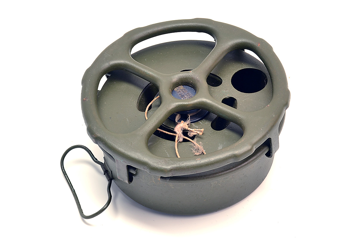 AN INERT U.S PRACTICE LAND-MINE, of World War Two type, in olive green with spoked pressure-plate