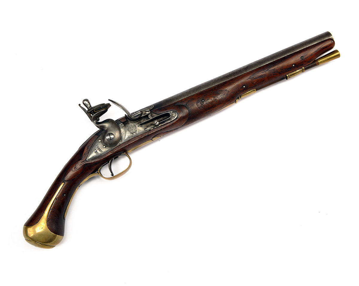 A DECORATIVE INERT FLINTLOCK PISTOL, in imitation of an English military 18th century holster pistol, wood, brass and steel construction, approximately 19 1/2in. overall