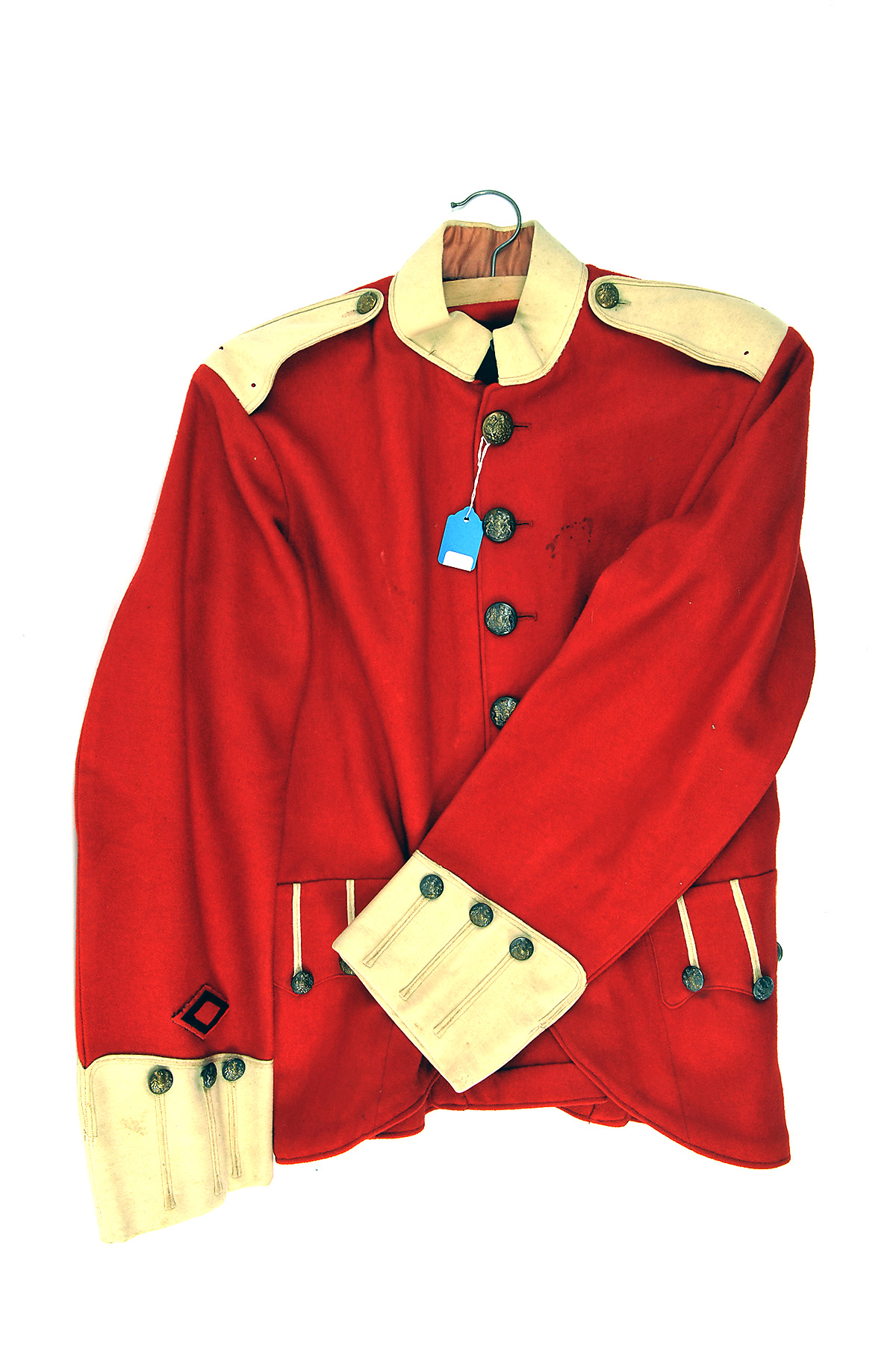 A SCOTTISH MUSICIAN'S DRESS TUNIC CIRCA WWI, red with white detail and rounded lower corners