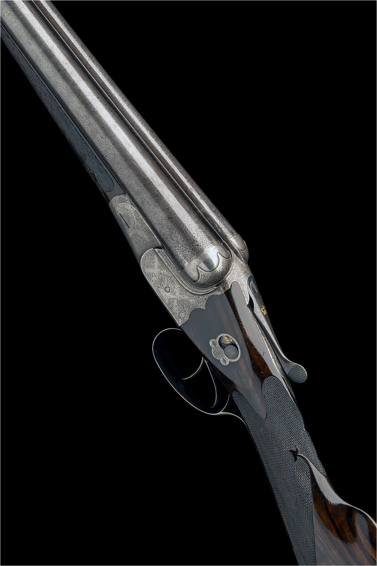 30in. nitro reproved Greener trade marked damascus barrels, the rib engraved 'W.W. GREENER. 68 HAYMARKET LONDON & ST. MARY'S SQUARE. BIRMINGHAM. WINNER AT THE LONDON GUN TRIALS 1875, 1877, 1878 & 1879', and with a crane at the breech end, the tubes with fine acanthus detailing at the breech ends, 2 1/2in. chambers, bored approx. 3/4 and full choke, some internal pitting, scroll-back treble-grip action with arcaded fences and side shoulders, the toplever gold-inlaid with a crown, manual side safety with gold-inlaid 'SAFE' detail, fine acanthus scroll engraving with some ropework bordering, retaining very slight traces of original colour-hardening, 14 1/4in. well-figured stock with ornate chequering borders and inlaid horn drop points, horn buttplate, the fore-end decorated en suite, weight 6lb. 6oz., in its brass-cornered oak and leather case with green velveteen lining, gold-tooled green leather trade label and some accessories, including large Greener oil bottle, with a canvas and leather outer
