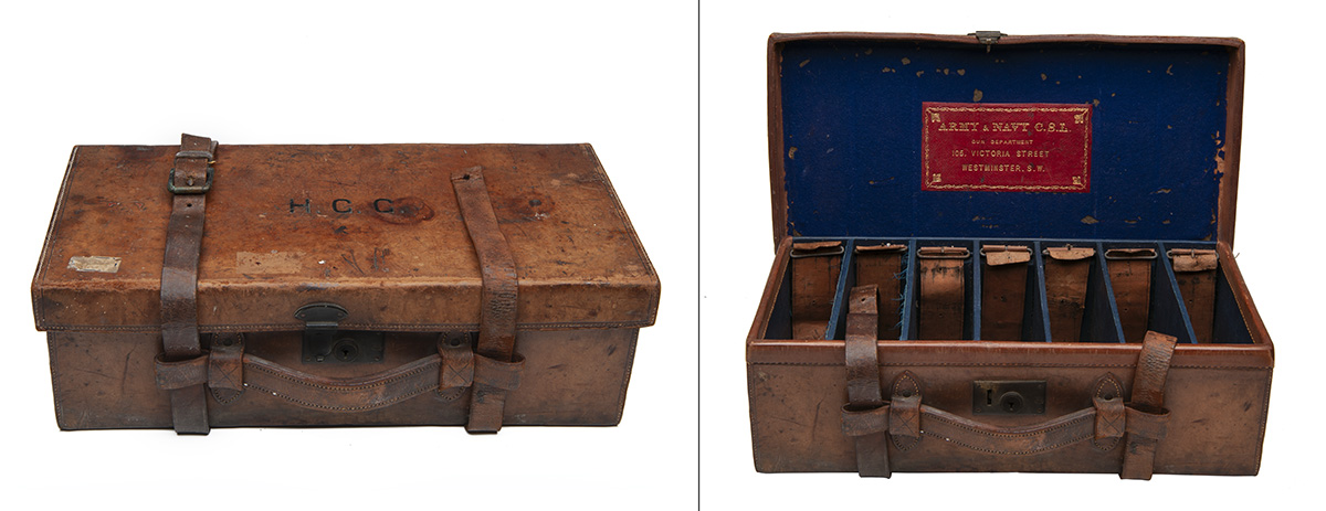 for approx. 600 cartridges, the interior lined with blue baize (moth damage) and blue canvas, a red leather gold-tooled Army & Navy C.S.L. trade label, six removable dividers, seven leather lifters, brass lock (key missing), the lid exterior with 'H.G.G.'