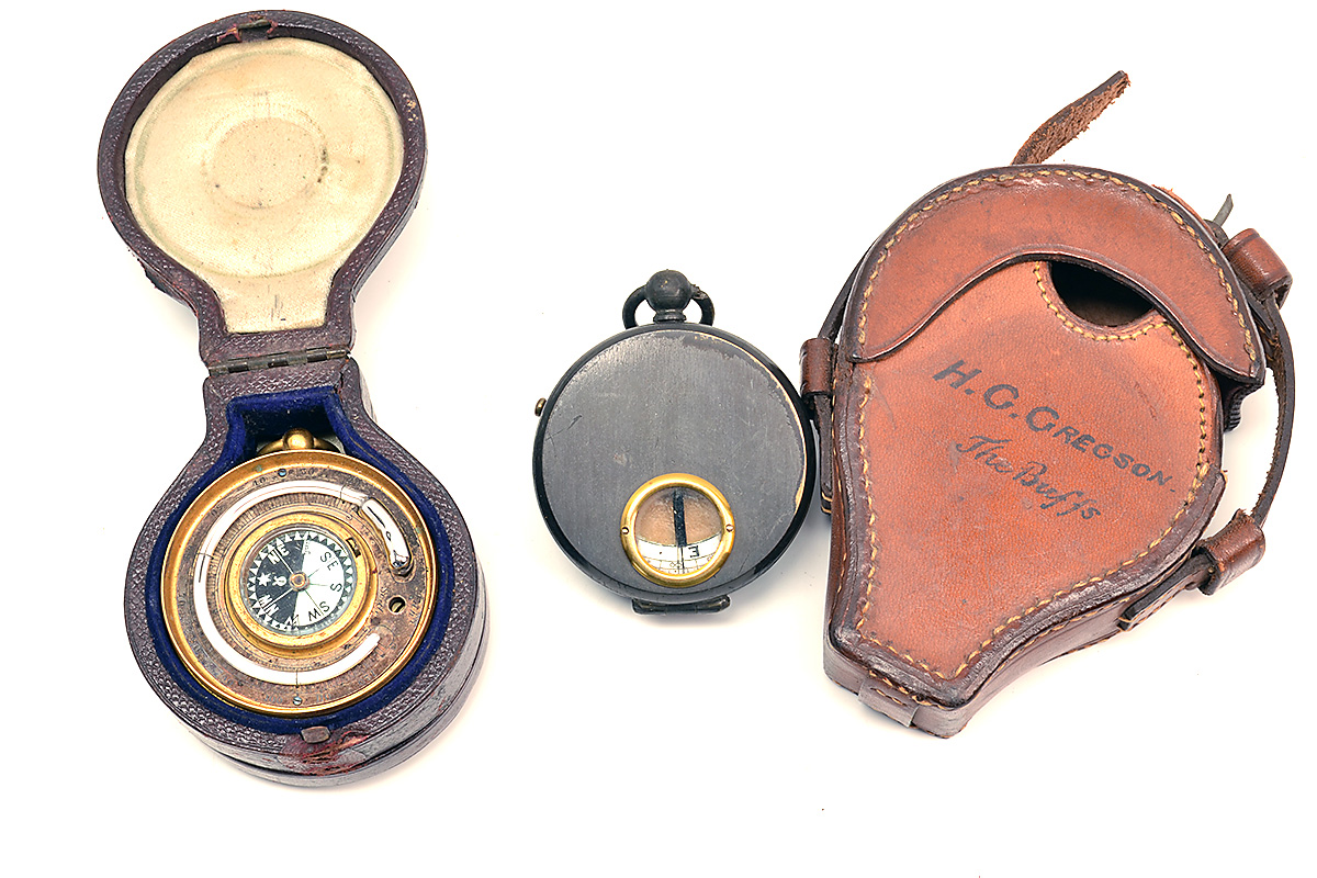 A WORLD WAR ONE COMPASS AND A POCKET BAROMETER, the first in a leather case marked to 'H.G. GREGSON, THE BUFFS', the second dated for 1882 and combined with a compass and thermometer on the reverse, in a pocket case (2)