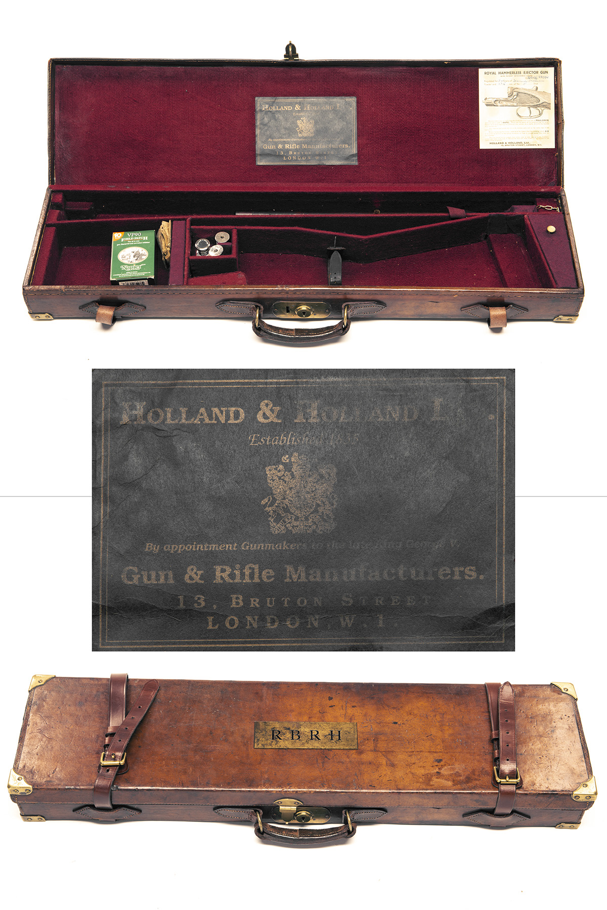 fitted for 30in. barrels, the interior lined with red maroon baize, copy of a Holland & Holland trade label, two piece cleaning rod, nickel plated oil bottle signed Holland & Holland, a pair of 12-bore nickel plated snap-caps signed Holland & Holland, brass lock (key missing), the lid exterior with a brass plaque marked 'RBRH'