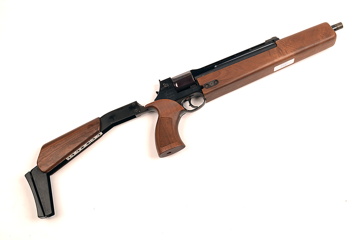 A .357 (MAG) SIX-SHOT LONG-BARRELLED REVOLVER SIGNED MATEBA, MODEL 'SPORTIVA GRIFFONE', serial no. 001219, with 13in. barrel threaded for a muzzle-break or sound moderator, rotaing cylinder firing from the bottom chamber, double action mechanism and permanently attached shoulder extension and walnut fore-end, in an abs plastic travel-case
