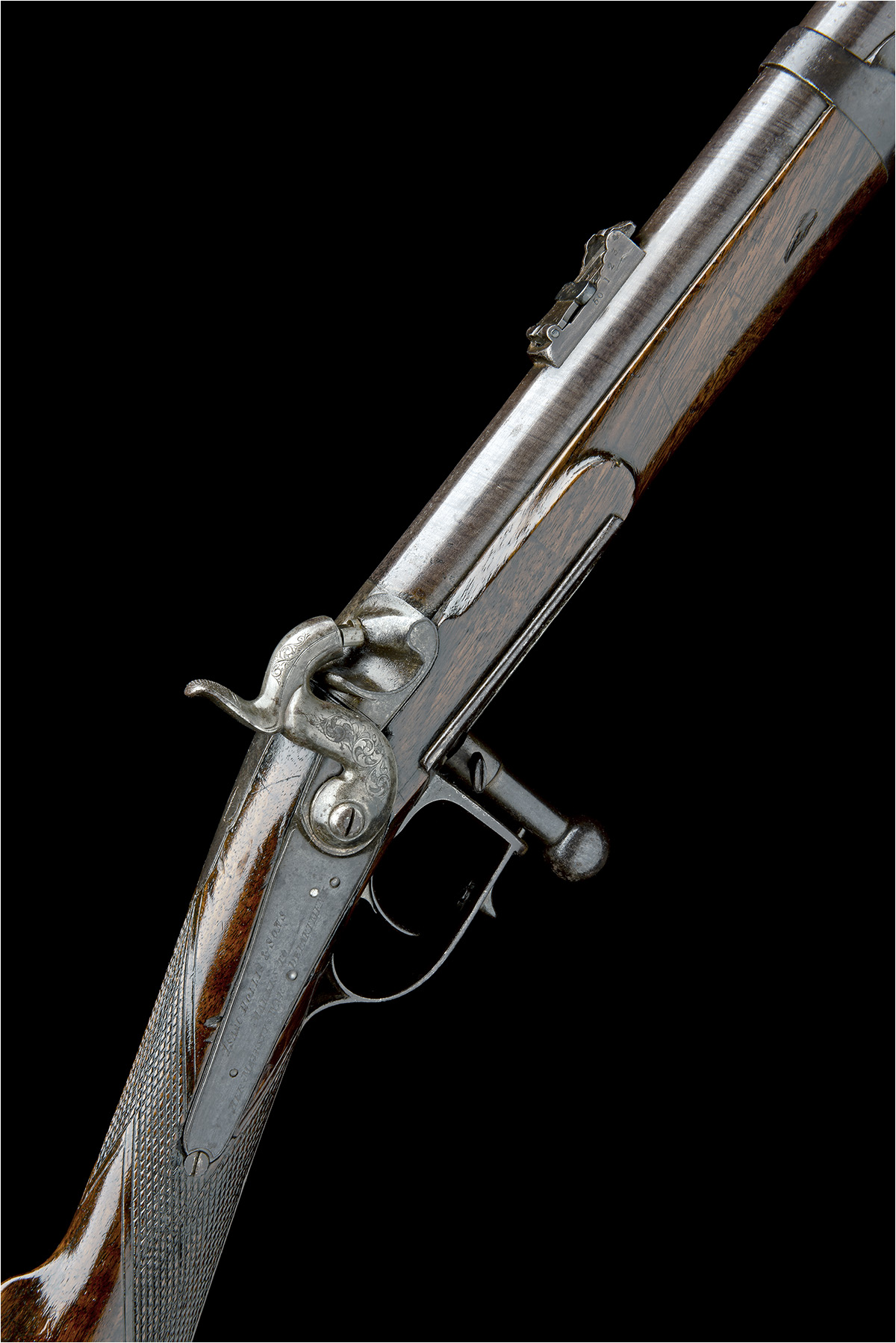 built to F. Prince's patent no. 386 of 21st February 1855, with 26 3/4in. browned two-stage round twist barrel rifled with five grooves, the flat top to the plain breech signed 'MADE FOR H. & J. VINCENT, MELBOURNE, block and blade fore-sight, small ladder rear-sight, the top of breech block engraved 'PRINCE'S PATENT', borderline engraved top-tang, borderline engraved back-action lock signed 'ISAAC HOLLIS & SONS, MAKERS TO HER MAJESTYS WAR DEPARTMENT', scroll engraved hammer, walnut half-stock with chequered wrist, iron heel-plate with top-spur, iron trigger-guard bow with bolt locking-catch, under-slung bolt operating within an 'L' shaped iron guide set in the fore-end wood and moulded iron nose-cap
