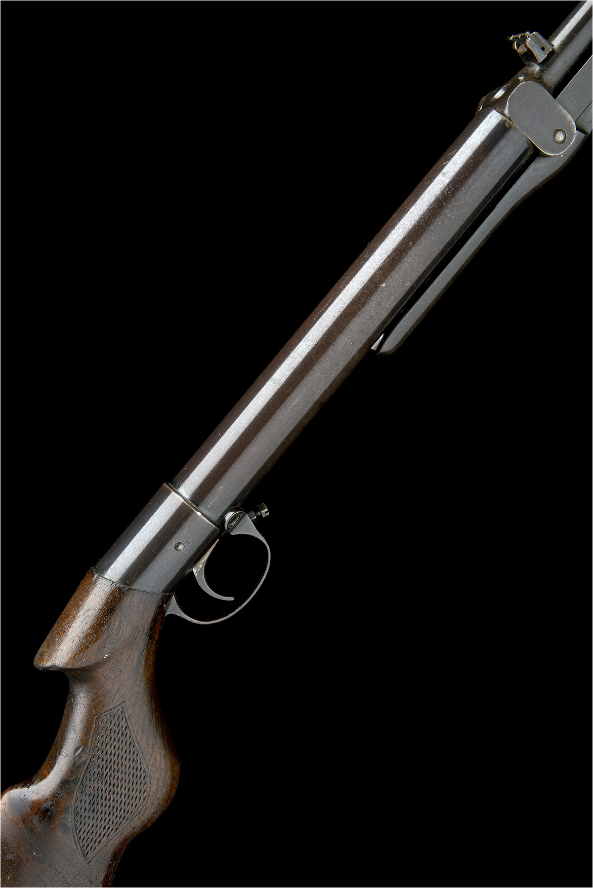 circa 1936, with tapering round 18 3/4in. barrel, dove-tailed fore-sight, elevating notch rear-sight, tap loading breech, plain air-chamber (no details visible), walnut saw-handled butt-stock with pressed chequering to grip, iron heel-plate, no provision for fore-end and push-button under-lever, strong amount of original finish remaining to metalwork