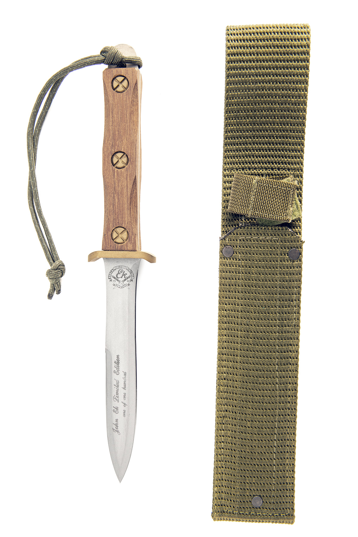 circa 1995, with grey phosphated 6 1/2in. narrow leaf-shaped blade fully edged on one side and half-edged on the reverse, the left hand face etched 'JOHN EK LIMITED EDITION' over 'ONE OF ONE HUNDRED' and with his '1941 Commando' trade-mark at hilt, the reverse with 'MADE IN USA EFFINGHAM IL.', short thick brass cross-guard with turned down tips, squared walnut handle with scalloped edges fixed by three large brass twin slotted screws, the tang extending to form the pommel and drilled for a lanyard (included), complete with its makers card carton, cordura nylon sheath and original bill of sale from 1995
