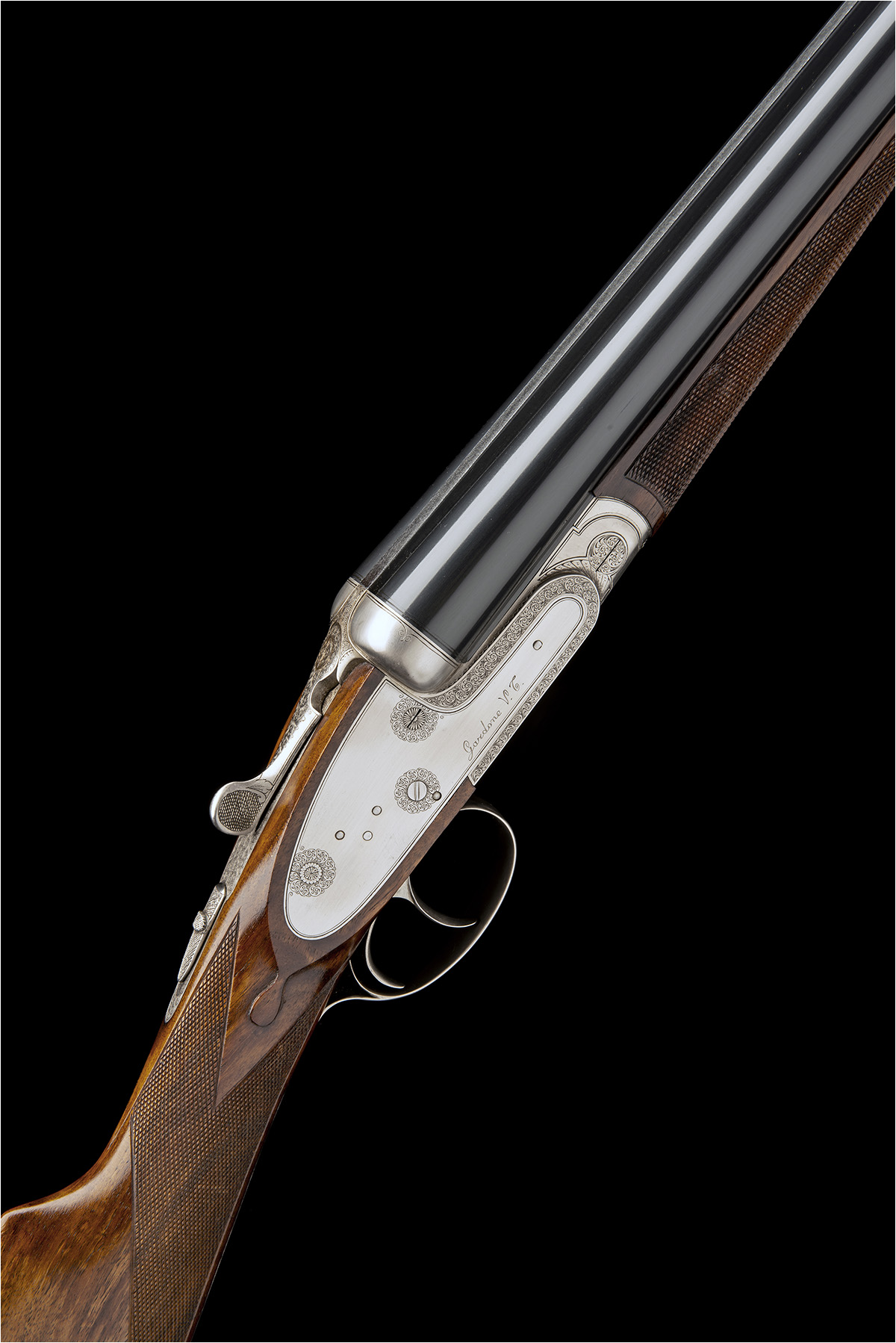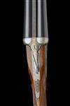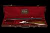 27 5/8in. (70cm) nitro chopperlump barrels with file cut rib, 2 3/4in. chambers, bored approx. imp. cyl. and 1/4 choke, manual safety, removable striker discs, cocking-indicators, articulated front trigger, rolled-edge triggerguard, partially engraved with fine acanthus scrollwork, the underside with the model designation in script, bright finish, 15in. figured stock, weight 7lb. 2oz., in its leather case