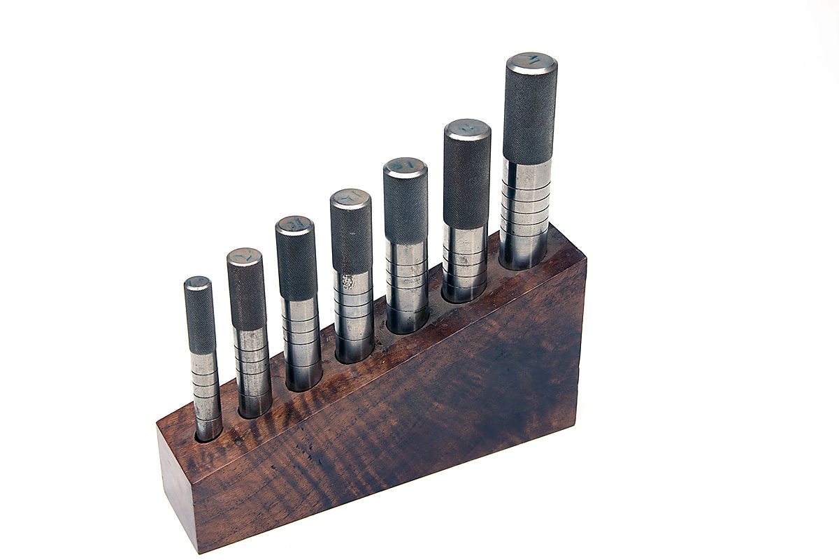 A SET OF SEVEN SHOTGUN CHAMBER GAUGES, comprising of gauges for .410, 20-bore, 12-bore, 10-bore, 8-bore, 4-bore