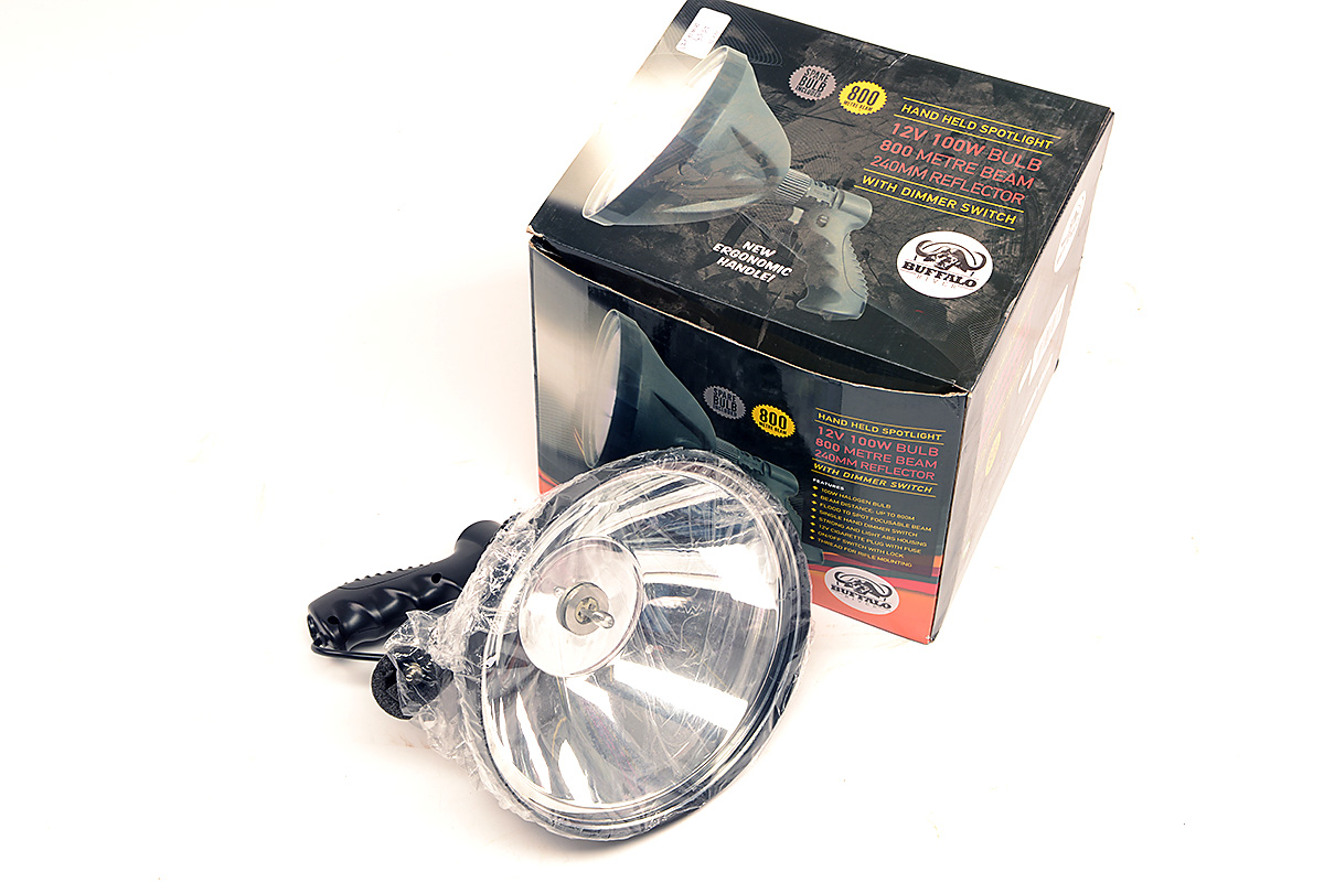 TWO NEW AND UNUSED BUFFALO RIVER 12 VOLT 100 WATT 800 METER BEAM HAND-HELP SPOTLIGHT