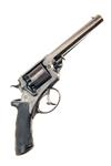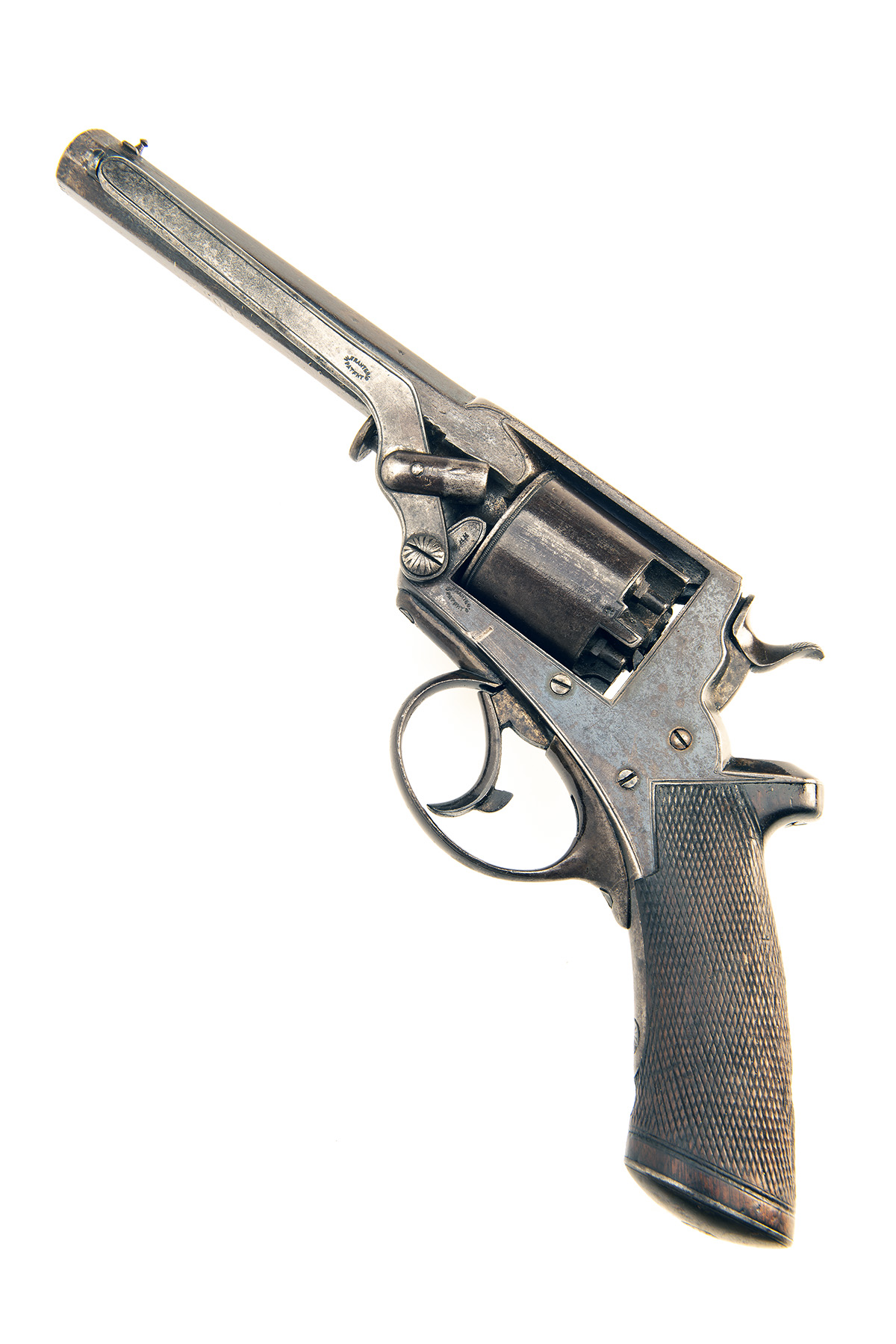circa 1856, with octagonal 6in. barrel, dove-tailed fore-sight, standing notch rear-sight, the top-strap borderline engraved and signed 'R.S. GARDEN', borderline engraved plain five shot cylinder with carved rope-twist to leading edge, borderline engraved blued frame with a rocking safe to right hand side, double action mechanism with spurred hammer and guarded trigger (return spring weak), chequered swept semi saw-handled walnut butt, engraved blued butt-cap and fitted with 'Tranter's Patent' articulated rammer on left side of barrel, strong traces of blued finish remaining