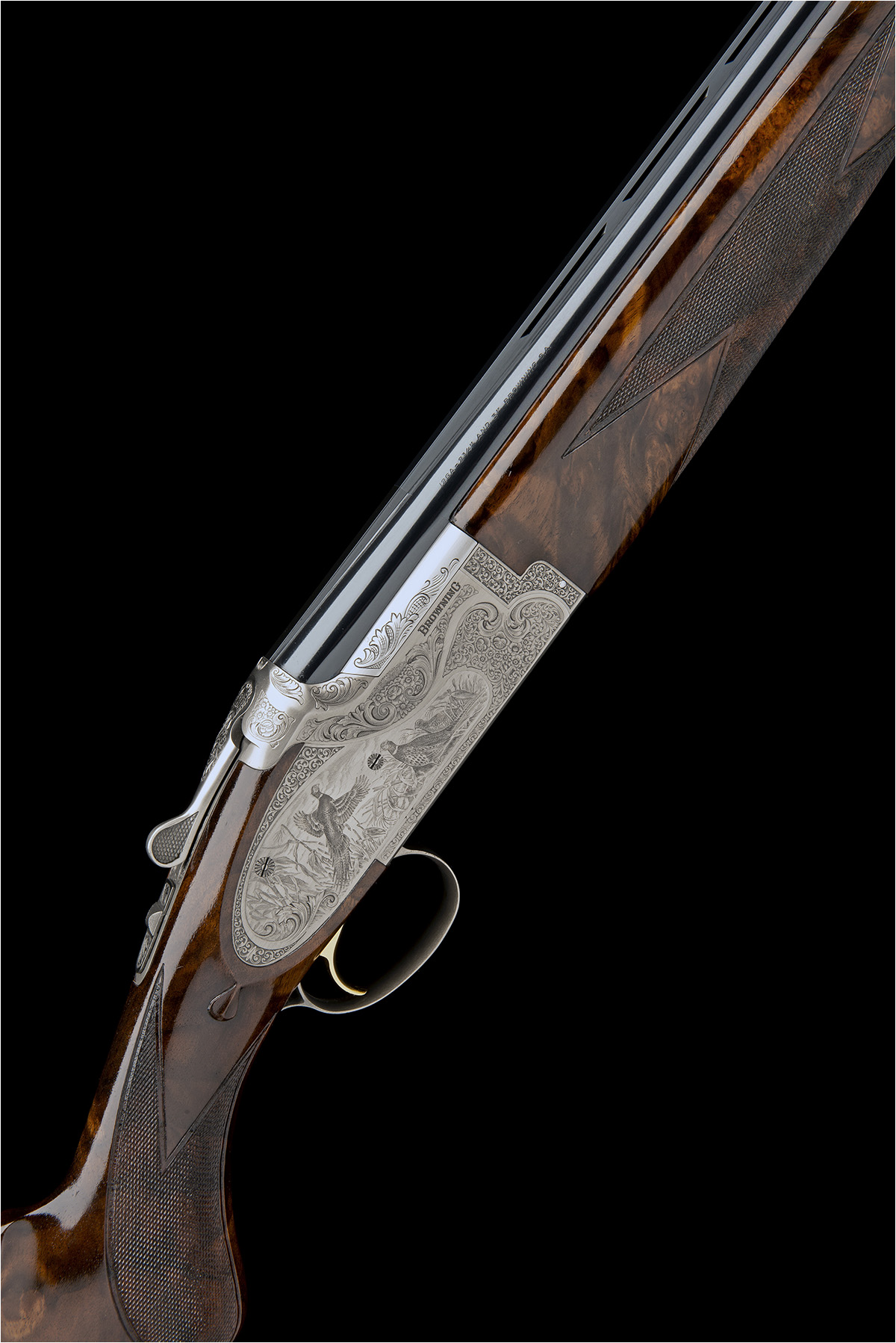28in. nitro barrels with 6mm ventilated matt top-rib, 3in. chambers, multichokes (with spares), manual safety with integral barrel selector switch, gold-washed adjustable trigger, action, sideplates and furniture engraved with floral and acanthus scroll engraving surrounding game scenes of English partridge and woodcock, the underside with scrolling banners engraved 'HERITAGE', signed 'Bottega C . Giovanelli', bright finish, 14in. figured semi-pistolgrip stock including buttplate, weight 7lb. 9oz., in its makers universal case